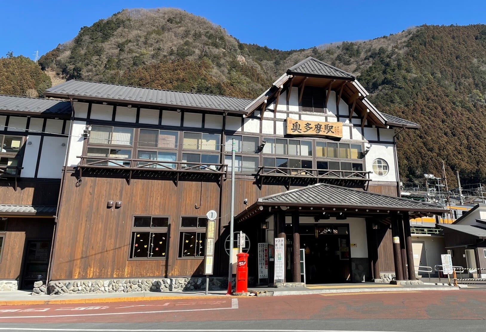 The station reopened April 2019 after being renovated with local wood from the forested western end of Tokyo. It is a rare example of a two-story woodframe train station in Japan, according to Nishizaki.