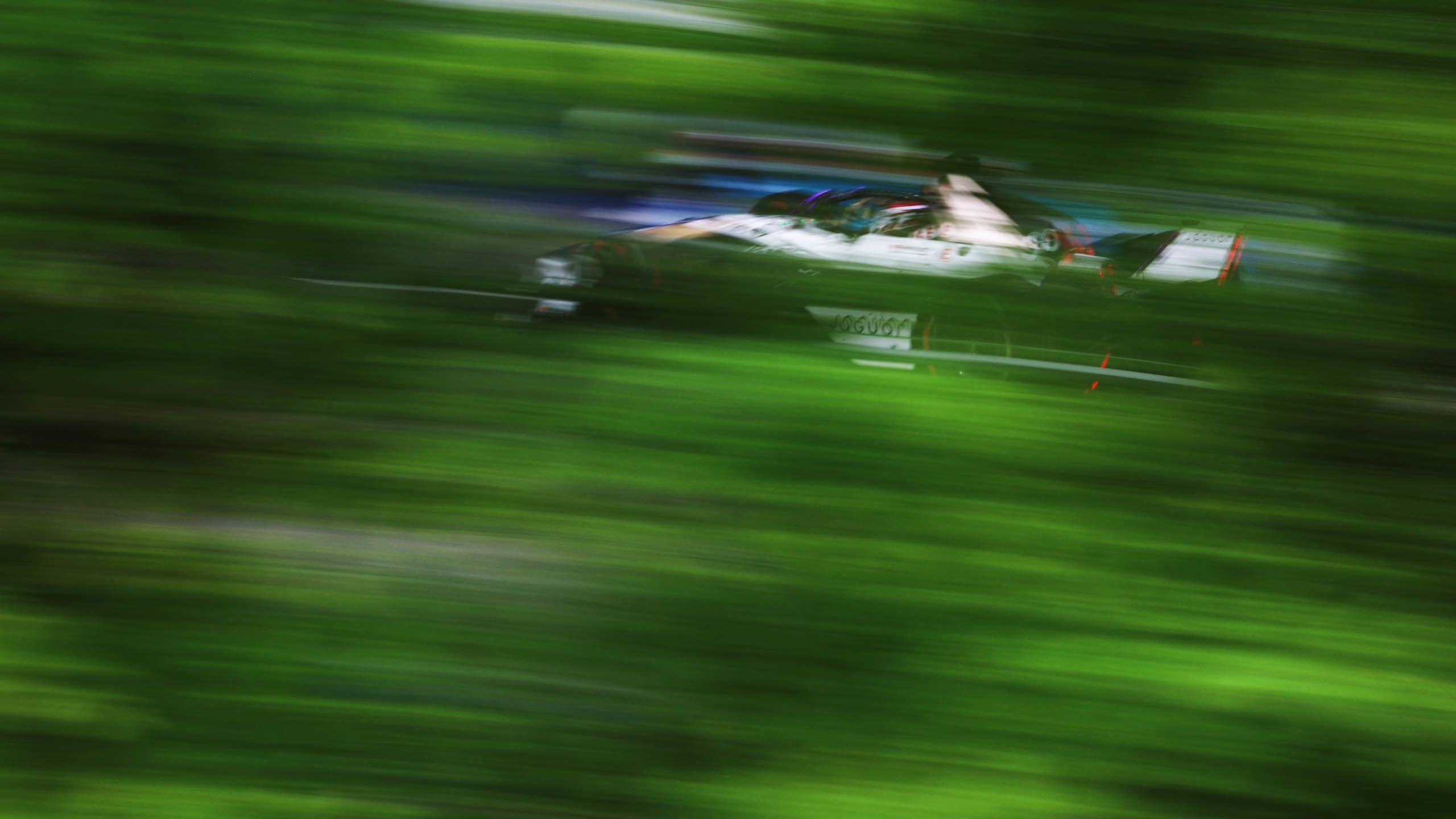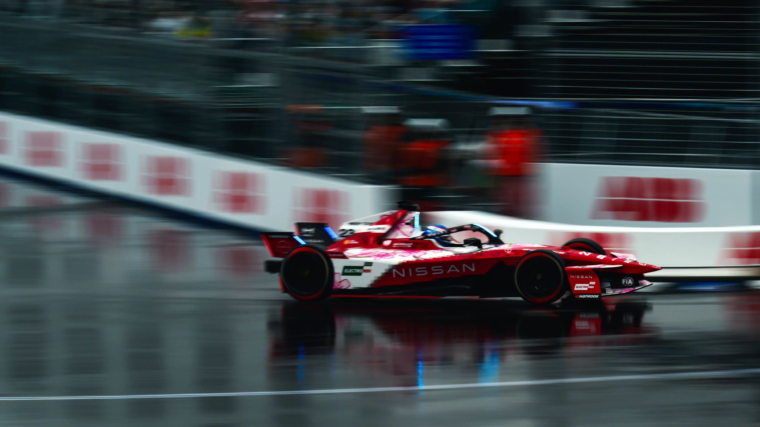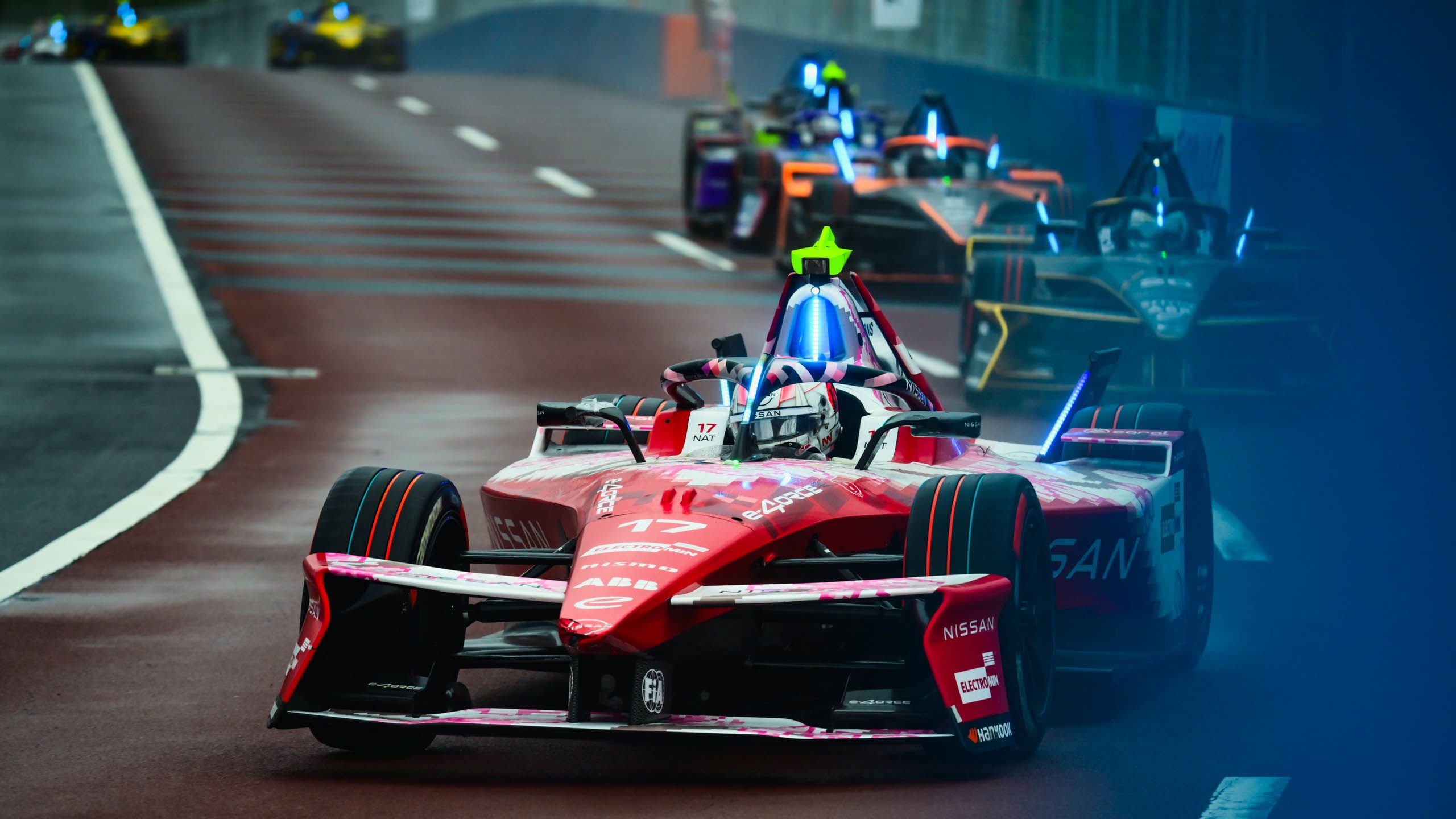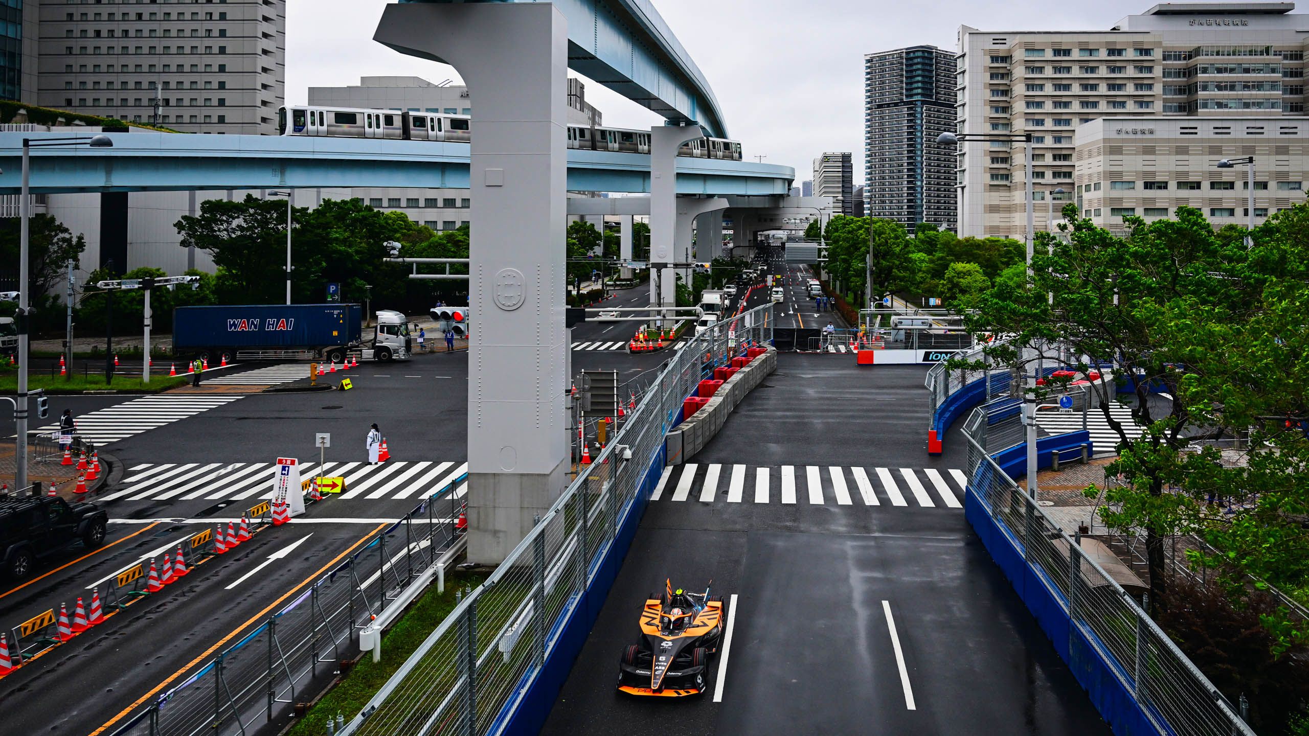 Britain’s Oliver Rowland of the Nissan Formula E Team drives in the rain during the Tokyo E-Prix on May 17. Rowland finished second in the race, but went on to win the following day’s race. (Photo by Tomoki Mera)