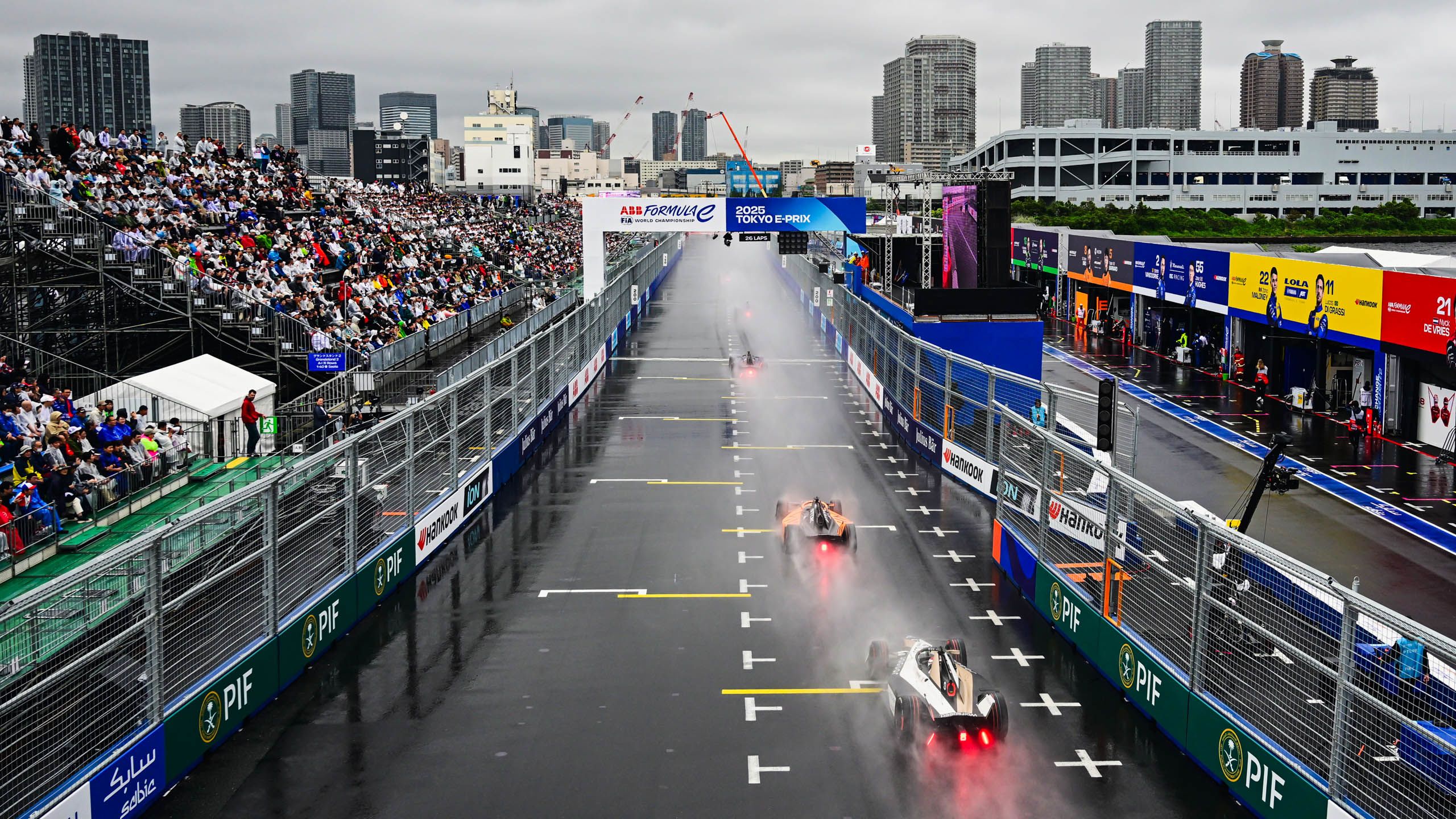 Twenty-two drivers from 11 teams competed in the Tokyo E-Prix held on May 17 and 18, with Round 8, pictured here, taking place in the rain. (Photo by Tomoki Mera)