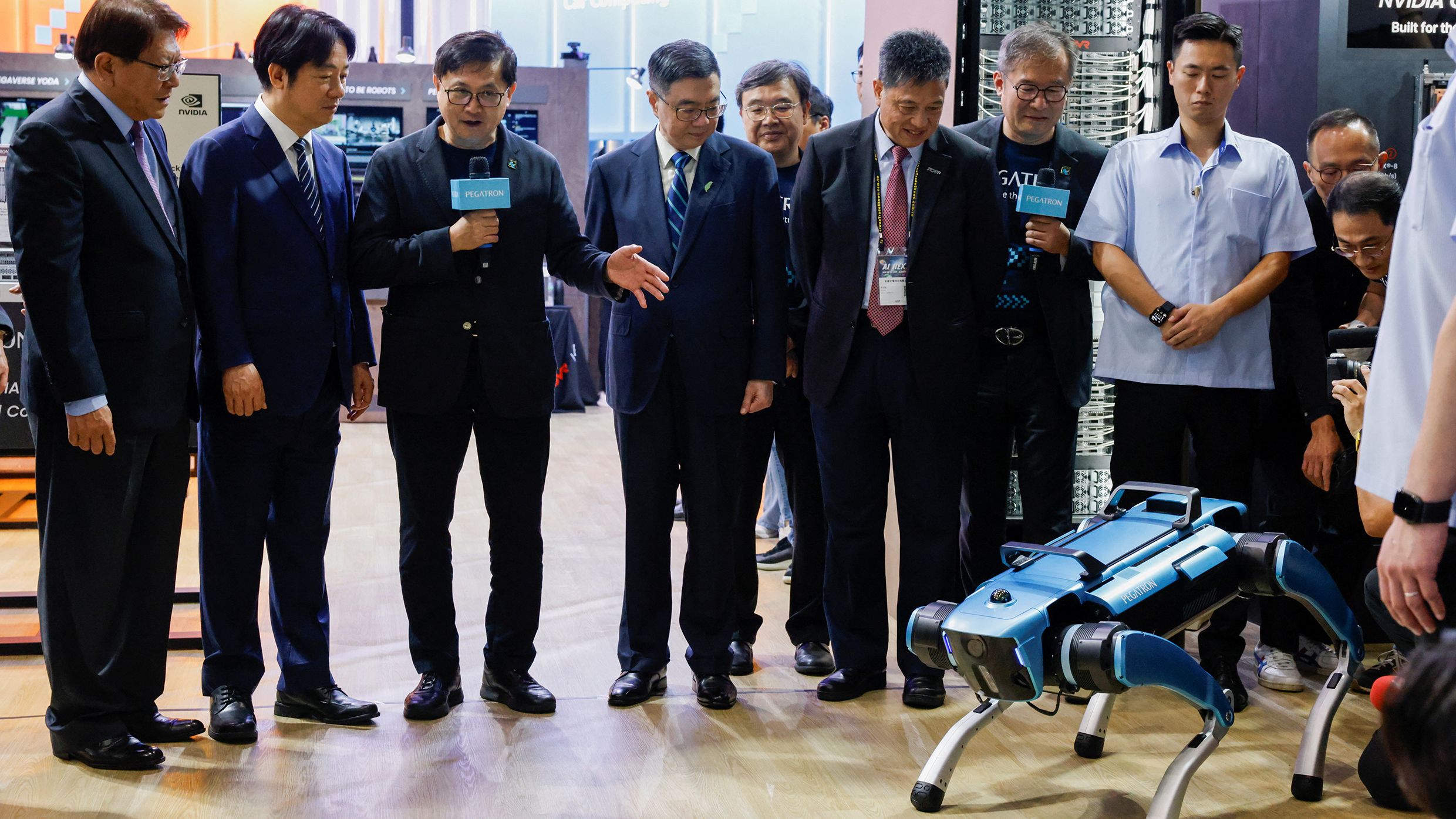 Taiwanese President Lai Ching-te, second from left, visits Pegatron’s booth at the Computex exhibition in Taipei on May 20. (Photo by Ann Wang/Reuters)