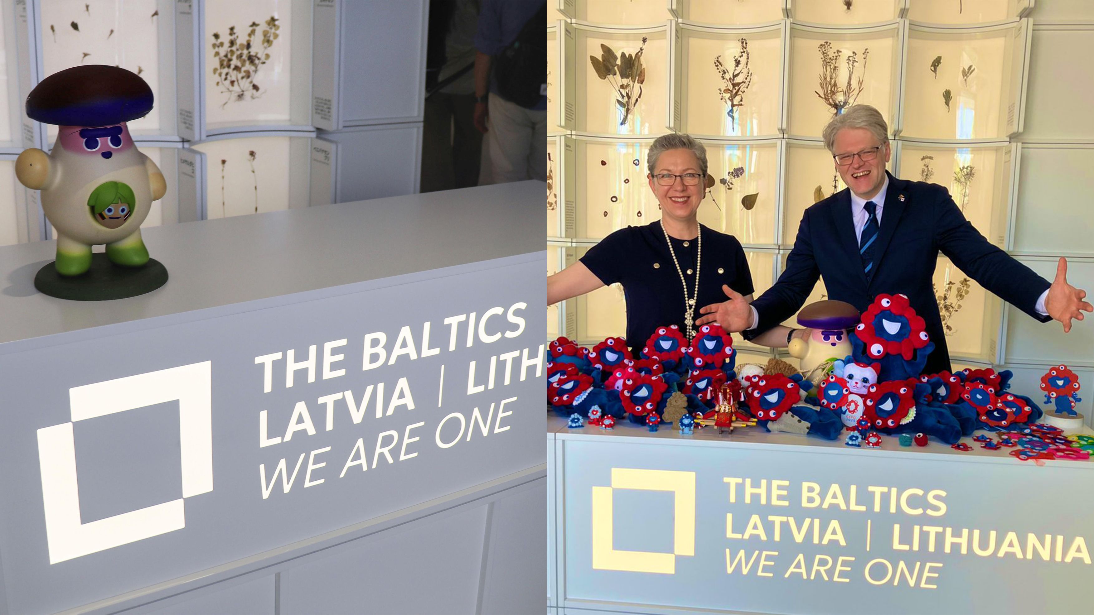 Barabi-chan, the Baltic Pavilion’s mascot for the World Exposition in Osaka, stands alone (left photo) on May 16 following the unsolved disappearance on May 13 of Myaku-Myaku, the expo’s official mascot. Information about the suspected theft spread online, and the pavilion was soon flooded with replacement Myaku-Myakus donated by visitors. Lithuanian Ambassador to Japan Aurelijus Zykas, right photo, on right, wrote on his X account: "I would like to express my sincere gratitude to the Japanese people who show their goodwill." (Source photos by Kyodo and screenshot from Aurelijus Zykas’ X page)