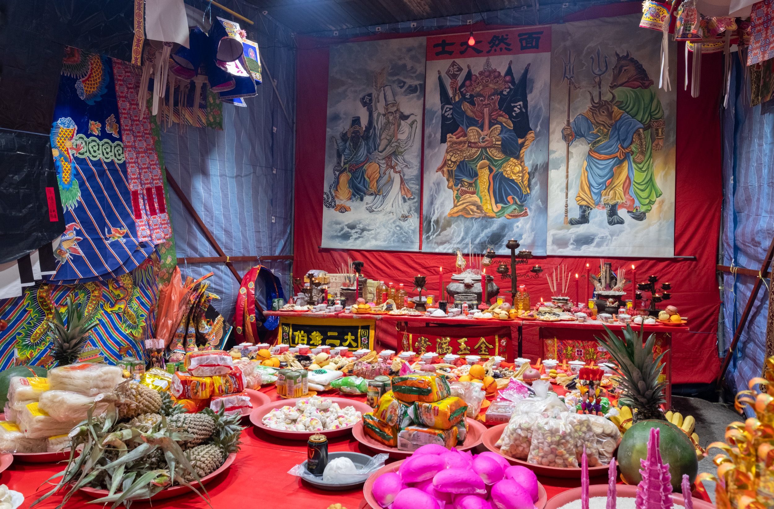 Plates laden with food offerings for ancestors line the tables of a makeshift shrine at the end of Carnarvon Street in central George Town. The paintings on the back wall depict deities and guardians from Chinese folk religion associated with guiding and protecting spirits in the afterlife.
