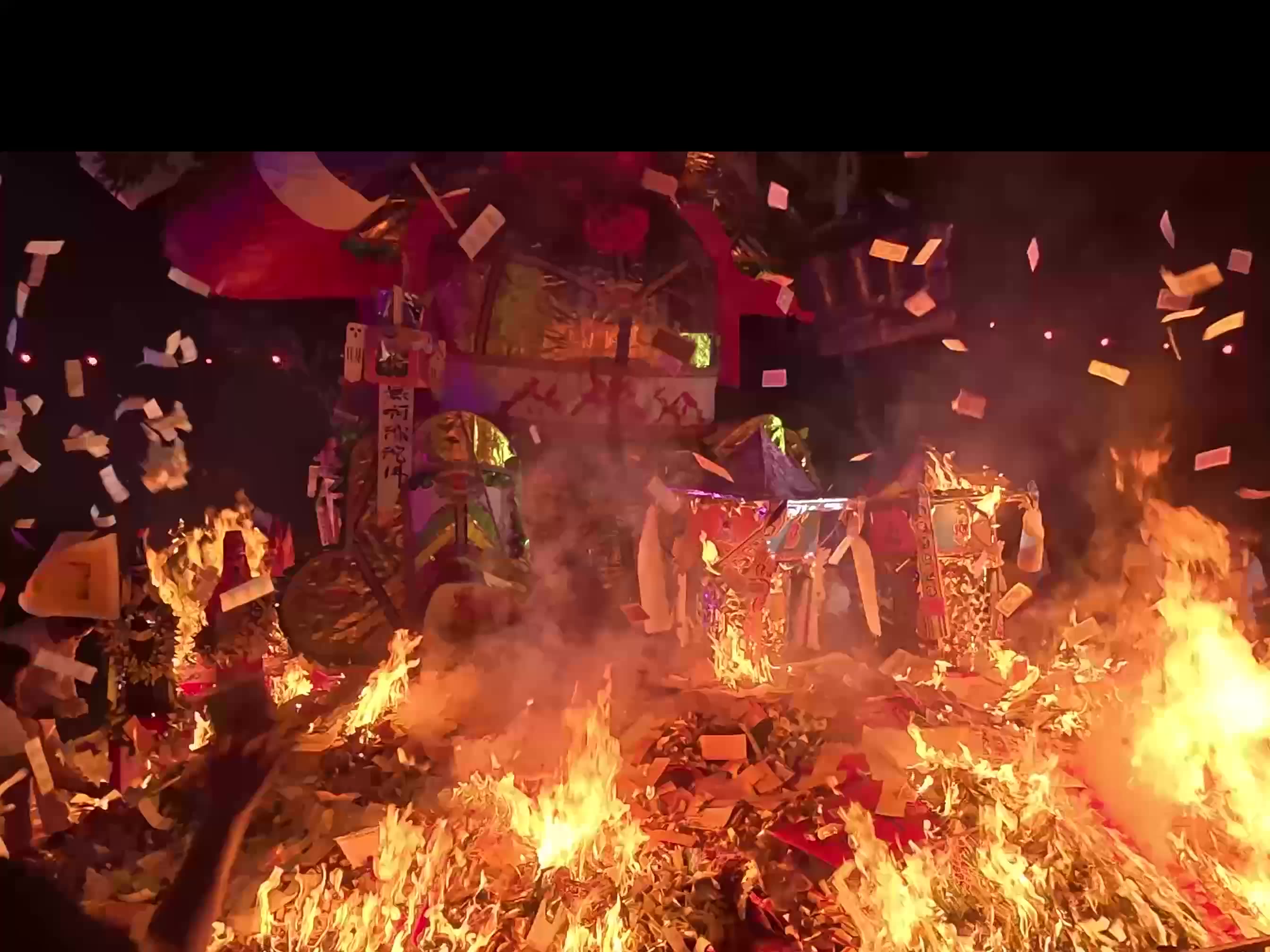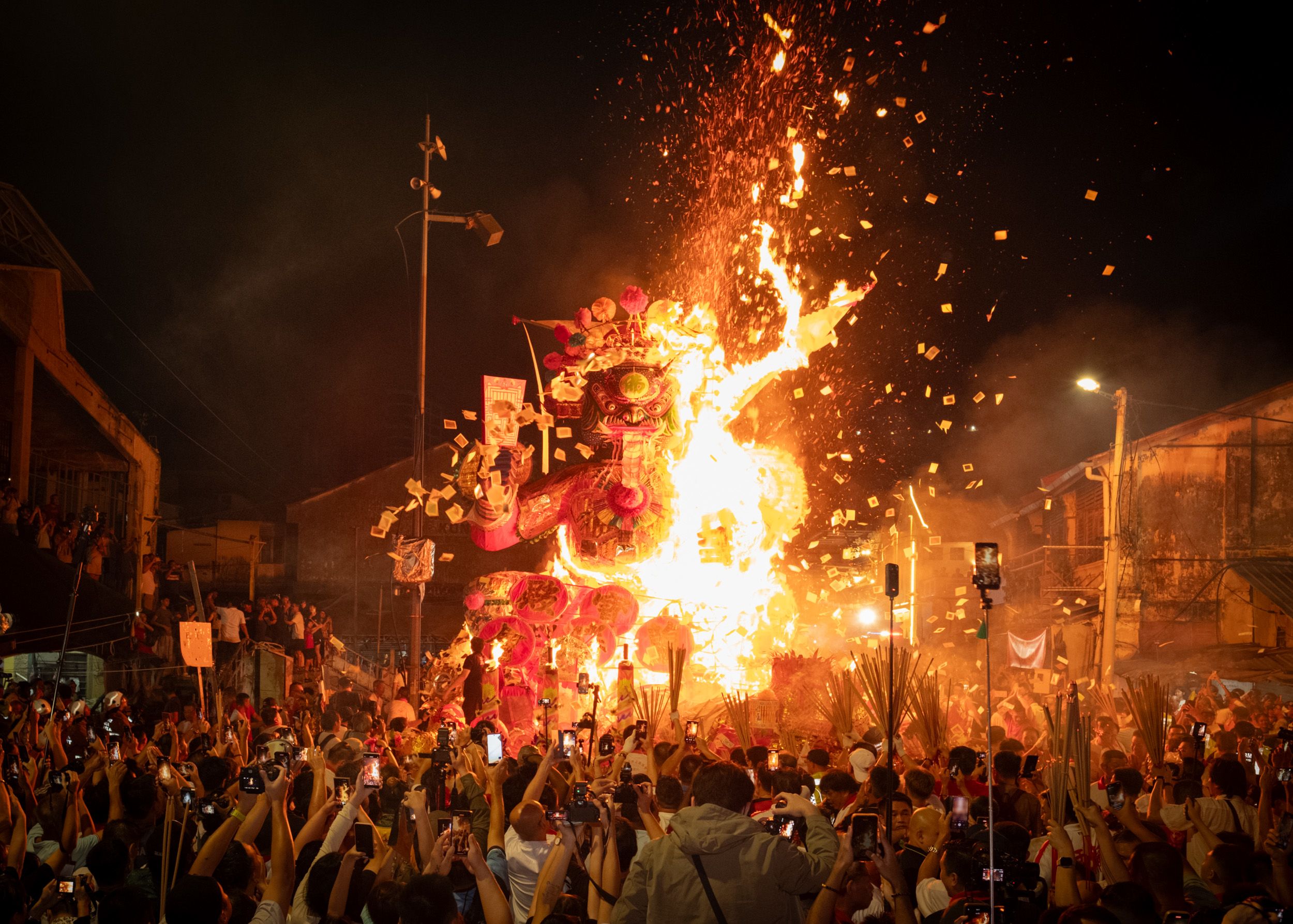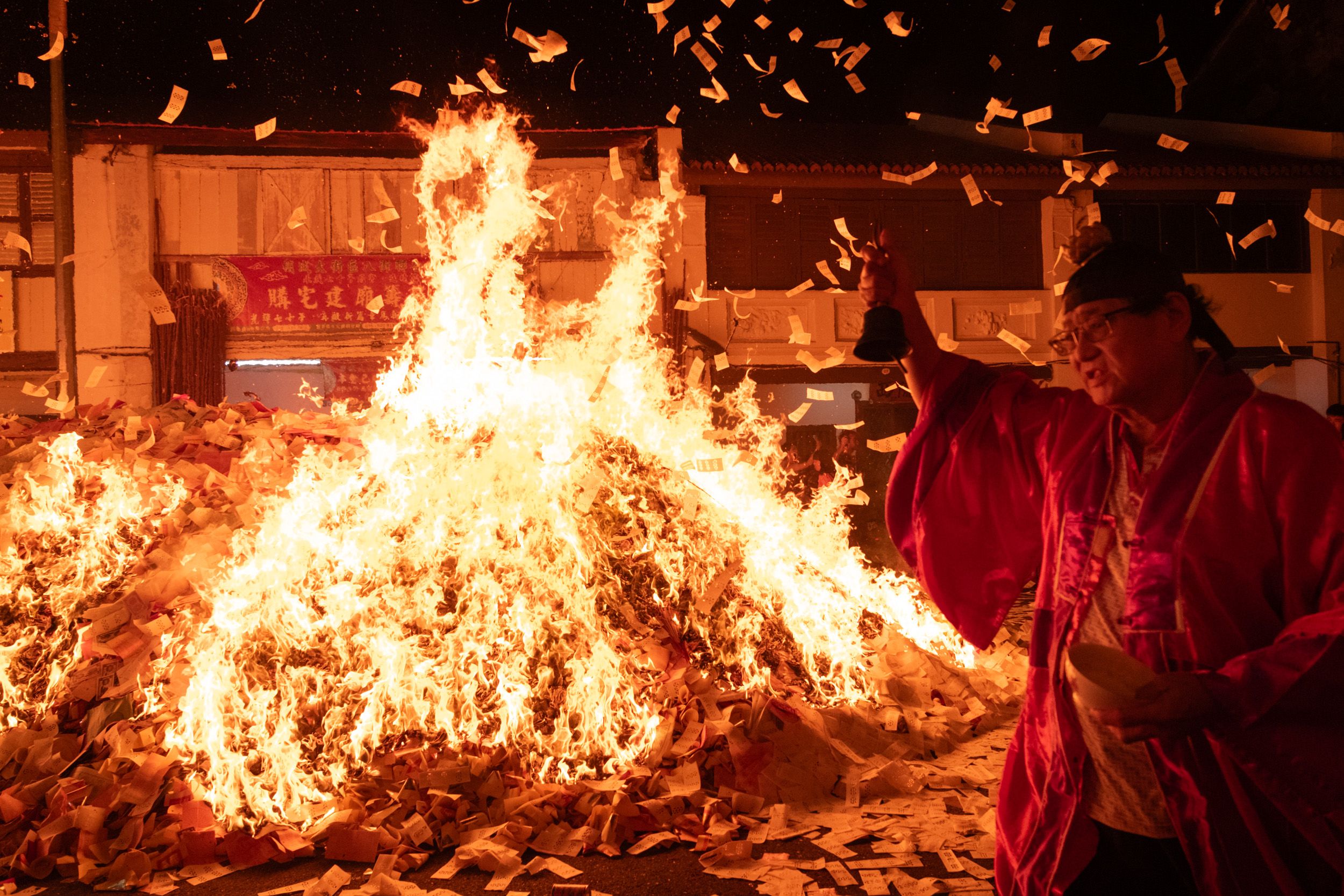 As the Tai Su Yeah effigy burns, heat forces the crowd to retreat. Only the fashi (mage in Mandarin), or ritual leader, remains, tolling a bell to complete the final rites.