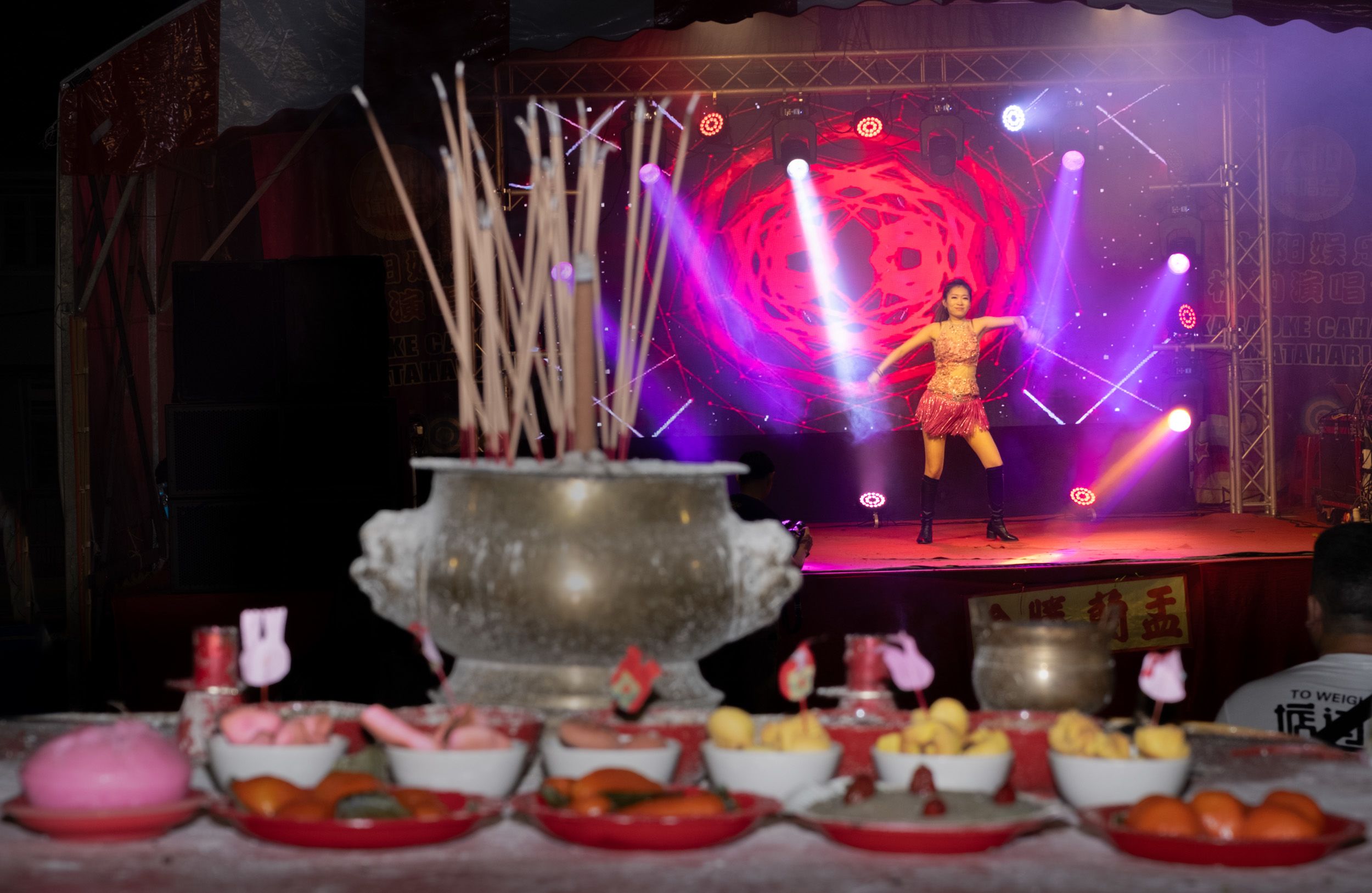 A scantily clad kotai singer dances to pounding techno beats before an altar of offerings. These shows add a modern touch to the Hungry Ghost Festival and cost less than hiring traditional Chinese opera troupes.