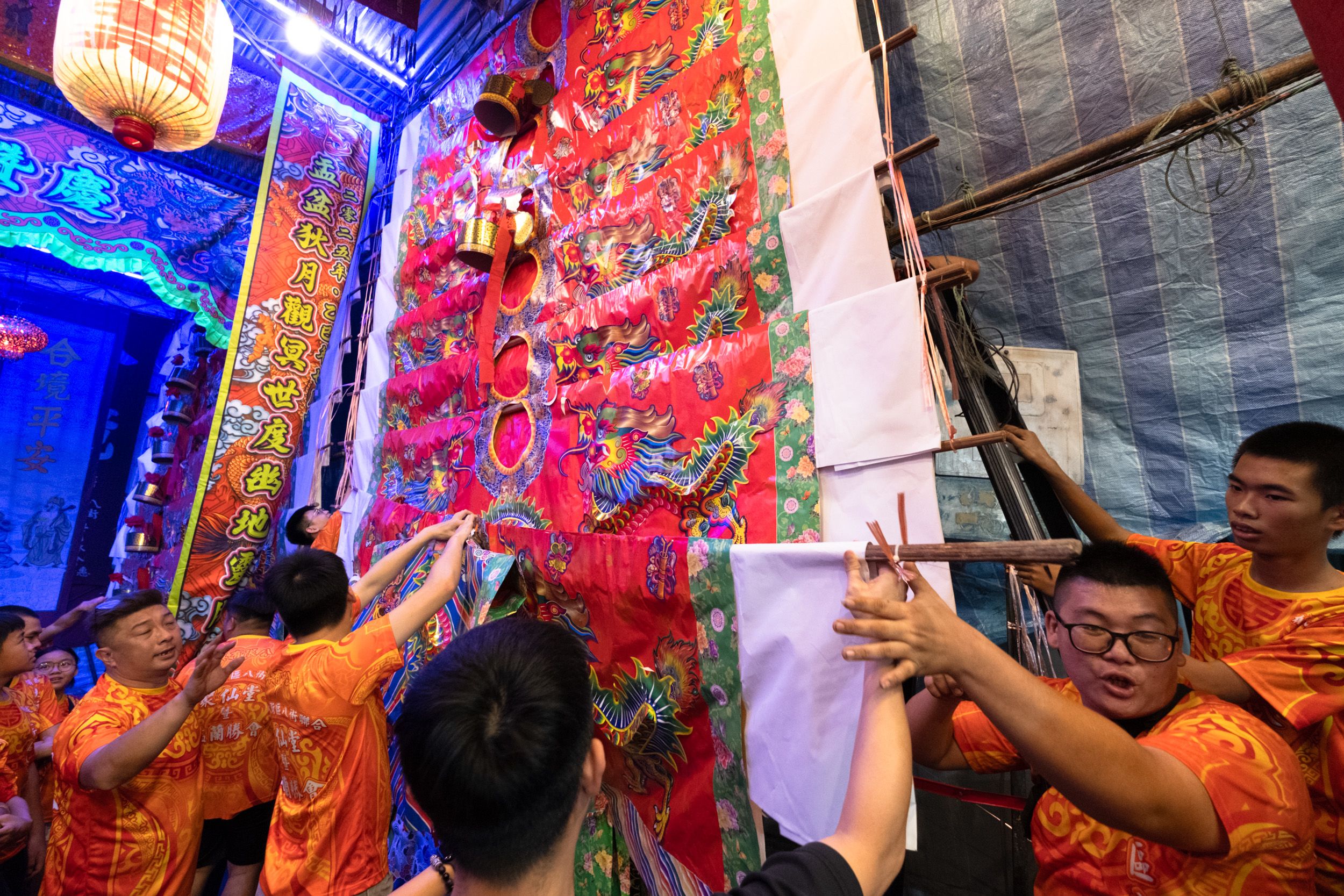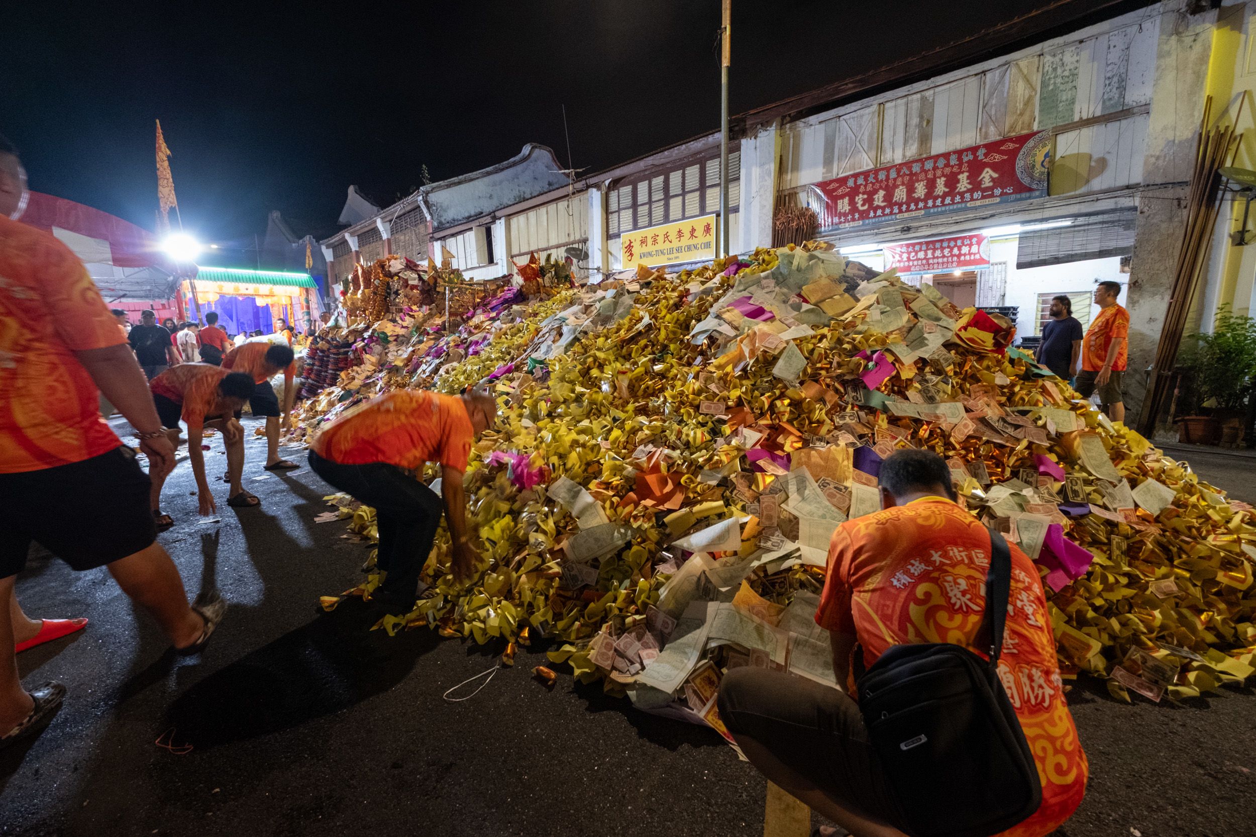On Queen Street, shrine committee members stack paper effigies of gold ingots and hell notes to prepare the ritual pyre. Statues of deities are placed on top before the fire is lit.