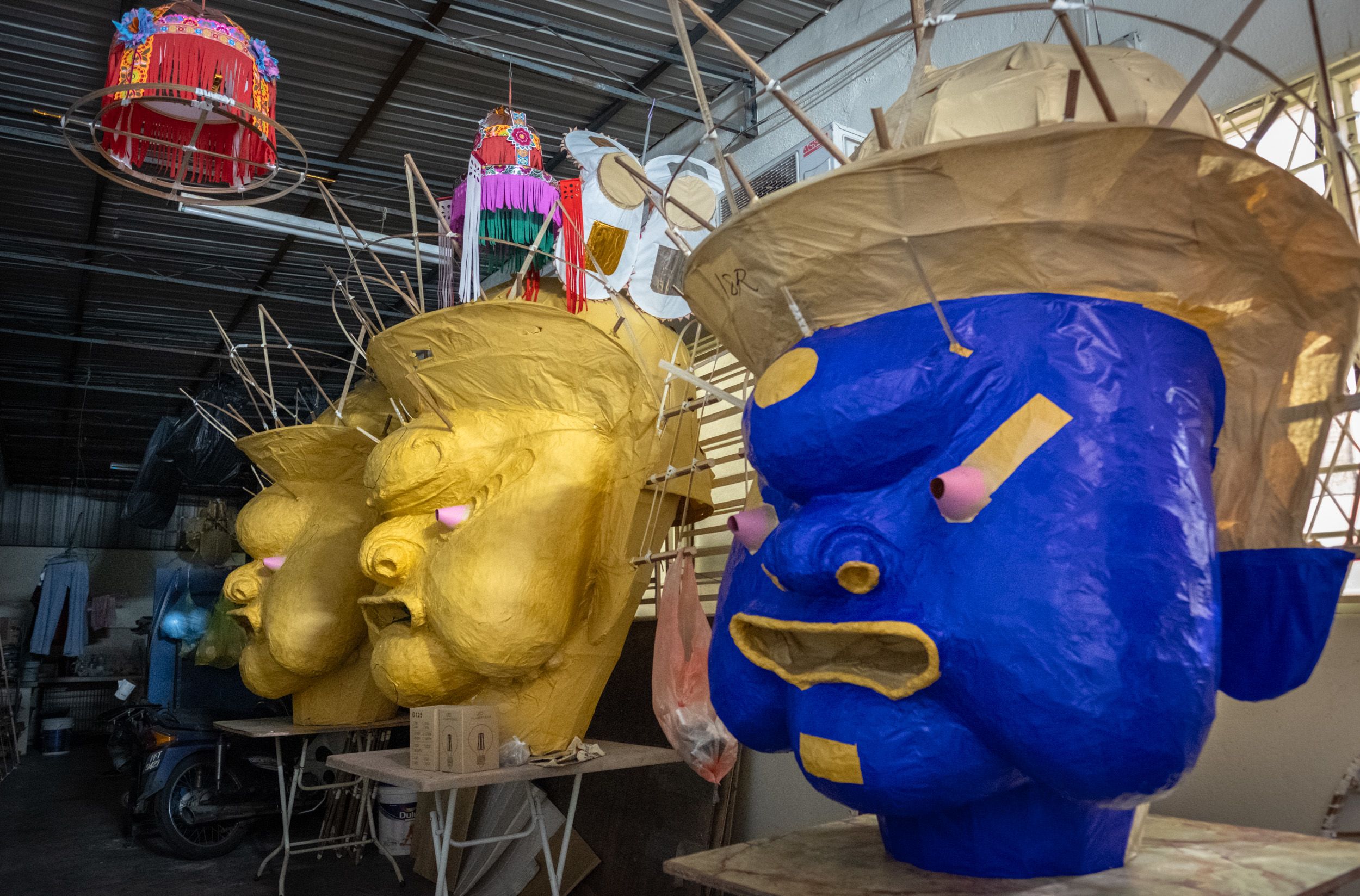 Unfinished Tai Su Yeah effigies sit in master craftsman Ng Chi Wang's workshop in Berapit, a suburb of Bukit Mertajam. The process takes his team weeks, layering paper over rattan frames before painting and decorating the finished figure.