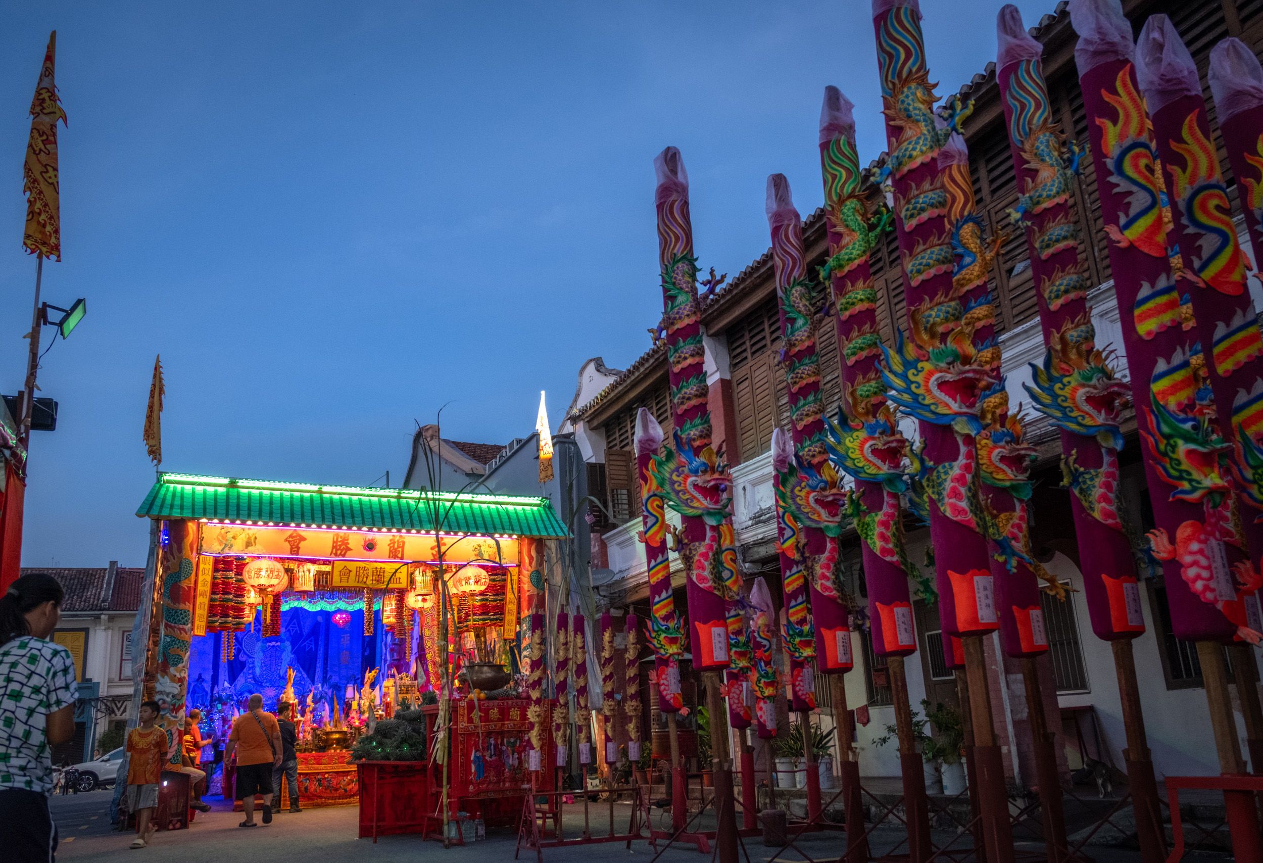 As the sun sets, a shrine at the end of George Town’s Queen Street readies for another night of Hungry Ghost Festival celebrations, which peaked on Aug. 29. Instead of a paper statue of Tai Su Yeah, a haunting 40-year-old canvas drawing presides over the festivities, with rows of tall dragon joss sticks standing outside ready to be lit.