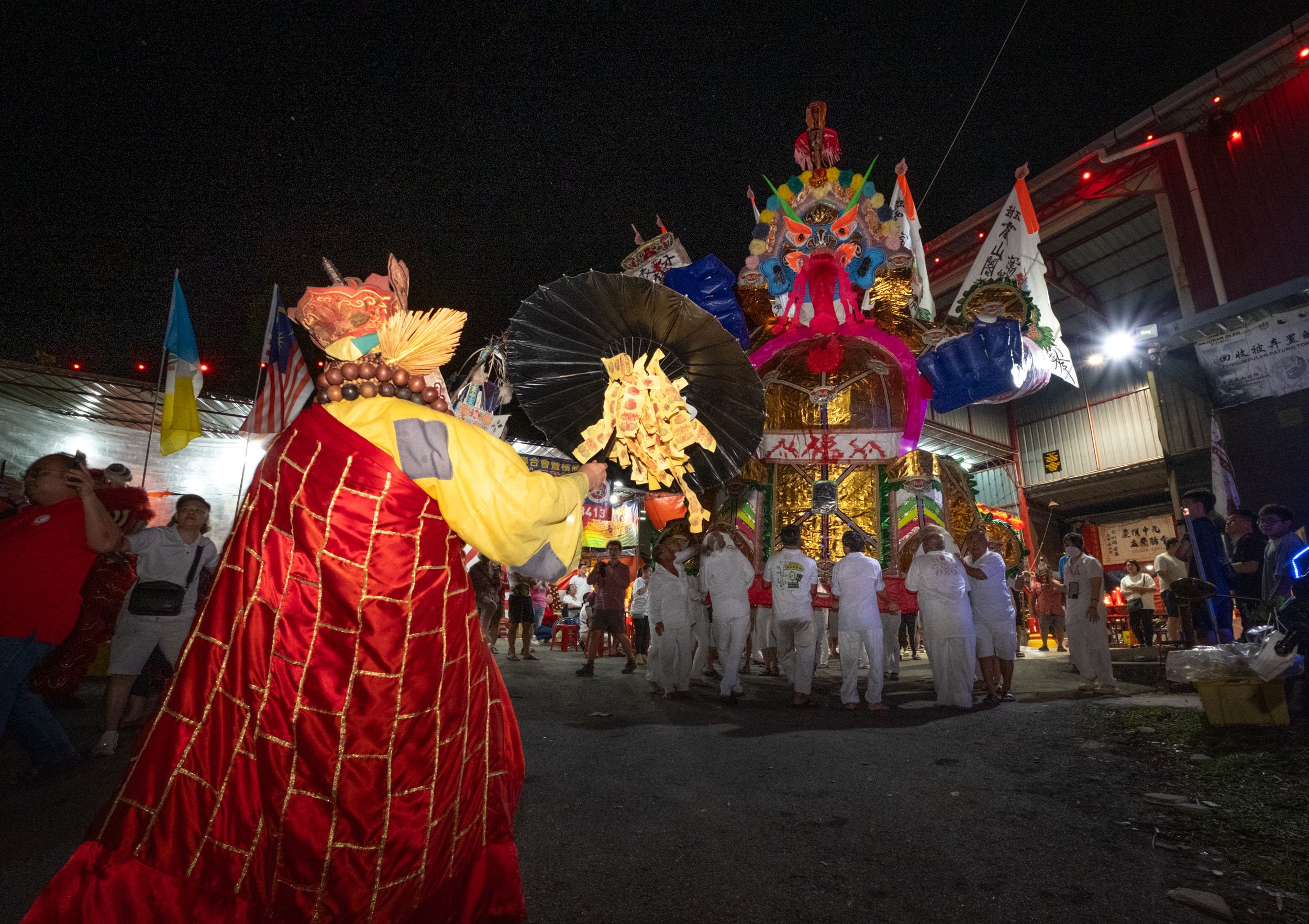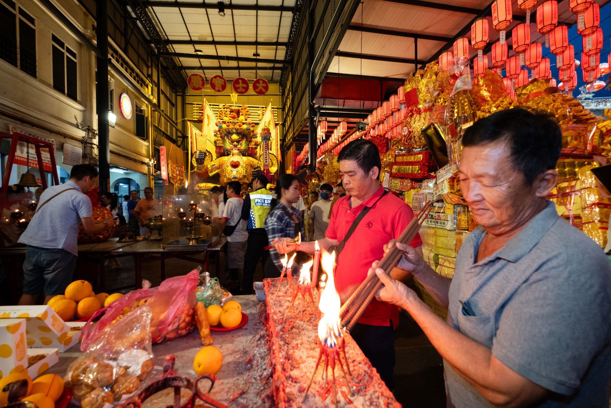 The air is thick with smoke from dozens of joss sticks wedged into prayer urns. Around a large wooden table in the middle of a makeshift temple, Malaysian Chinese devotees move in slow circles. Behind them, a paper-and-bamboo deity grins with carnivalesque delight.