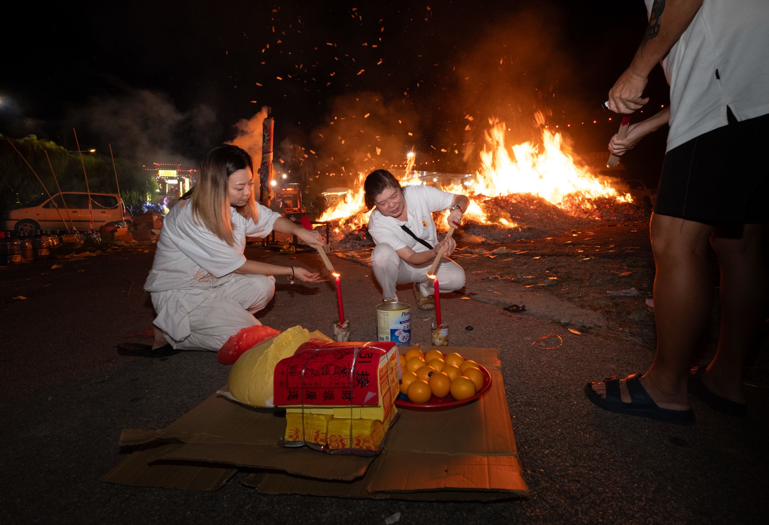 Outside Berapit’s Zhen Shan Kok Lau Hut Temple, women light candles and joss sticks as offerings to wandering spirits.