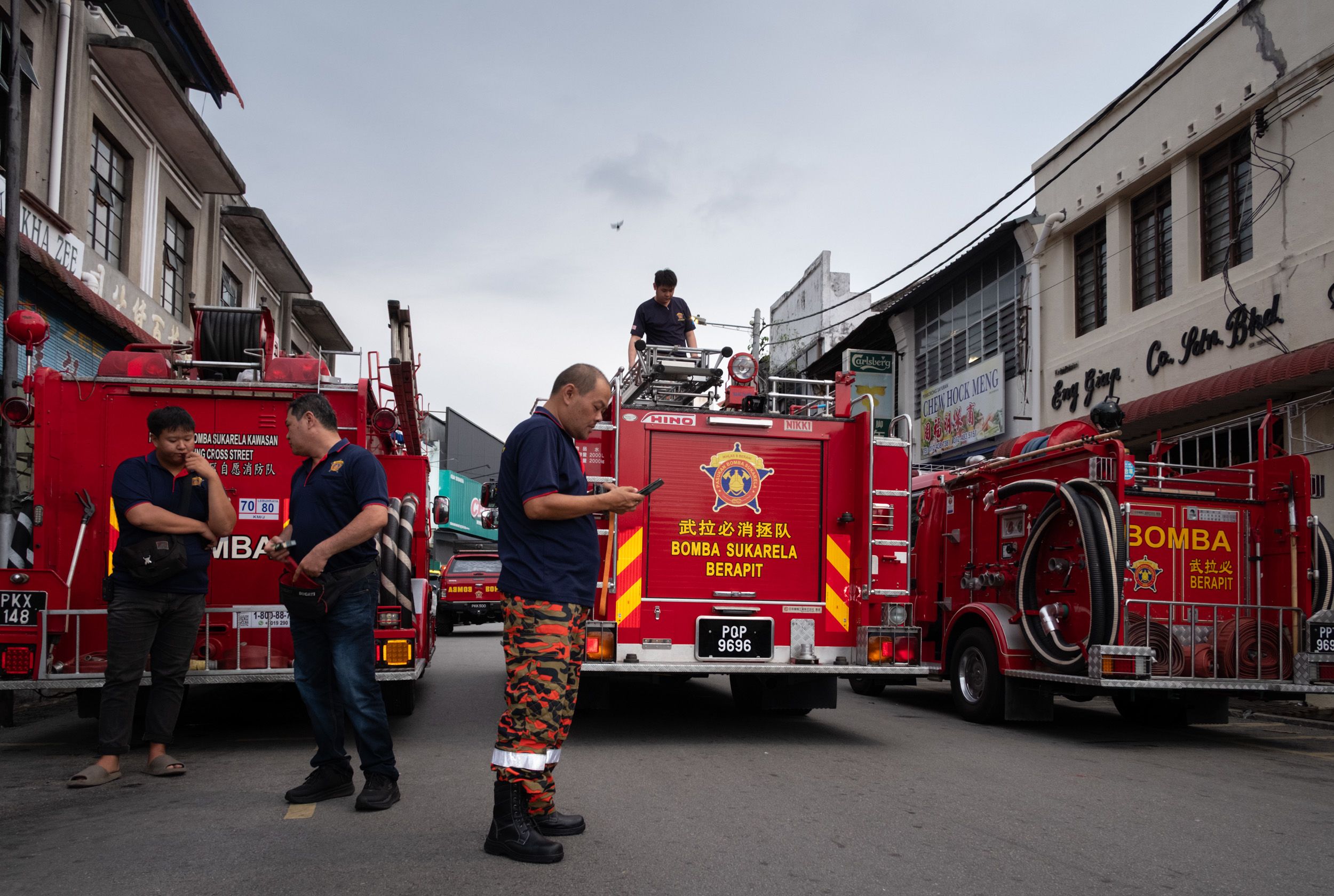 Firefighters from Berapit stand ready on Jalan Pasar in Bukit Mertajam, close to the 9-meter Tai Su Yeah effigy. As soon as the paper idol starts burning, they open their water hoses to contain the flames and keep the crowd safe.