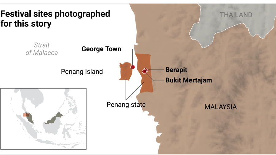 The festival is especially popular in Penang state, the only state where the number of ethnic Chinese people roughly equals the Malay population. Franco Tan, of the Penang Teong Guan Association, is overseeing a shrine on Queen Street, in the Little India district of George Town, on Penang Island. He says there are about 400 such locations across the state.