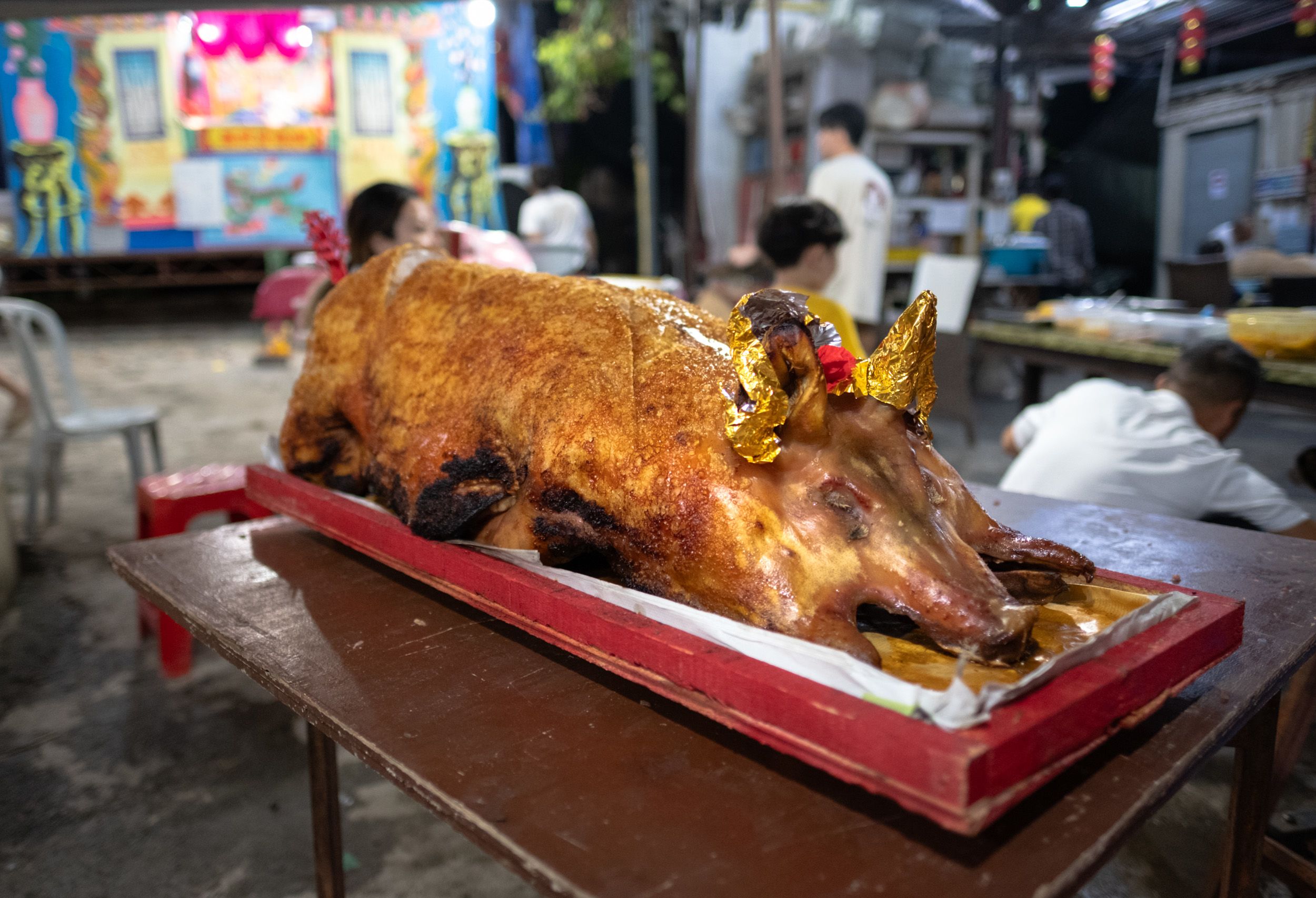 The roaming hungry ghosts are entertained with traditional Teochew steel-rod puppetry, while the living enjoy free slices of roasted pork distributed to the crowd.