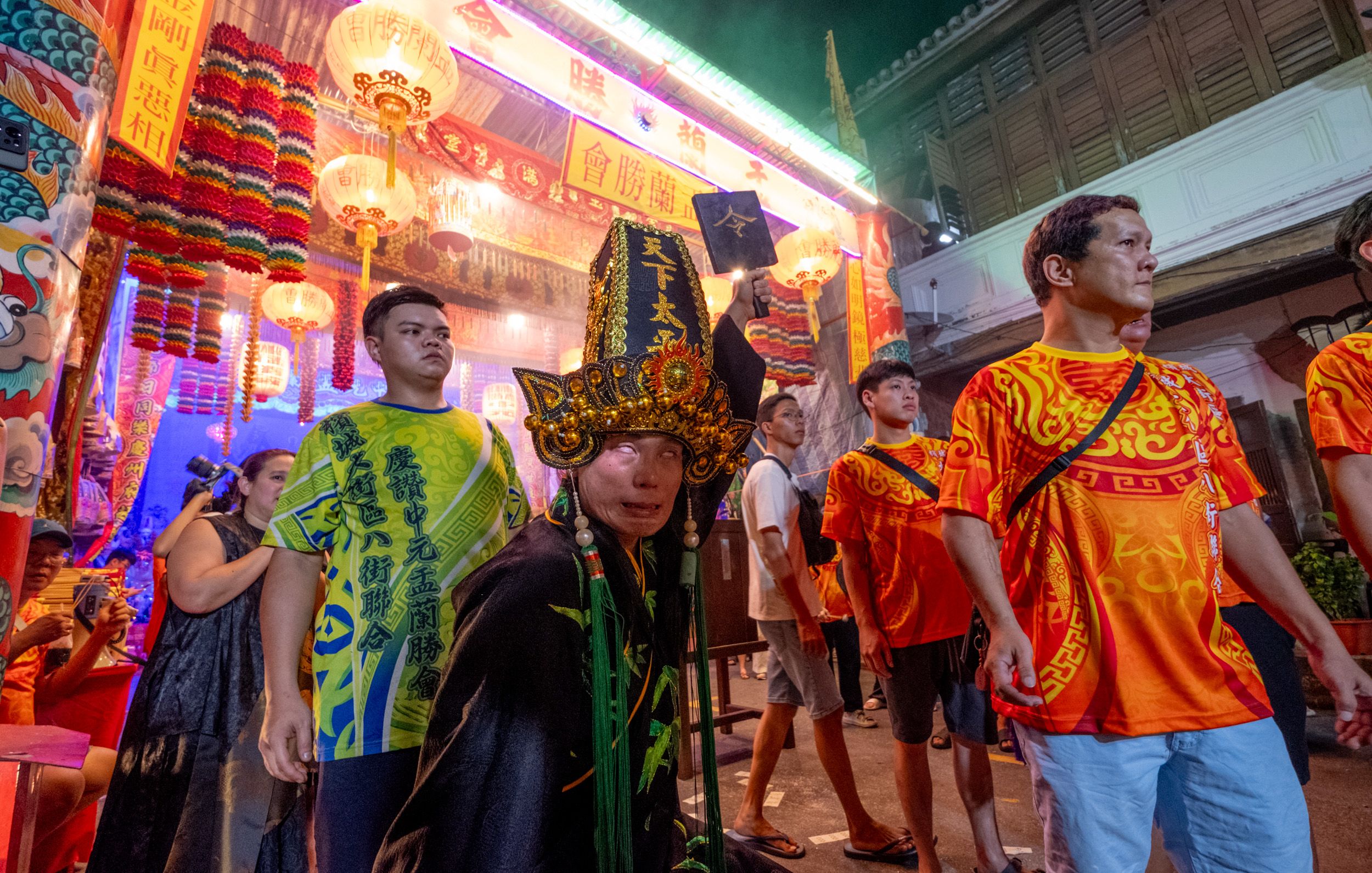 A spirit medium falls into trance at George Town’s Queen Street shrine. Known as tongji or jitong, these mediums are believed to channel folk deities, speaking in tongues and answering devotees’ questions about the future in a ritual process called tiao dang.