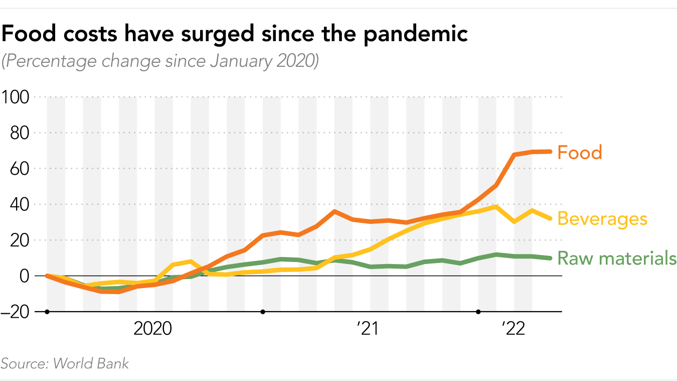 Food prices have shot up across Asia, hitting their highest levels since 2011. Farmers face droughts and ice storms, rising costs of fertilizer and fuel, pandemic-related labor shortages, and supply chain disruptions exacerbated by the Russian invasion of Ukraine.