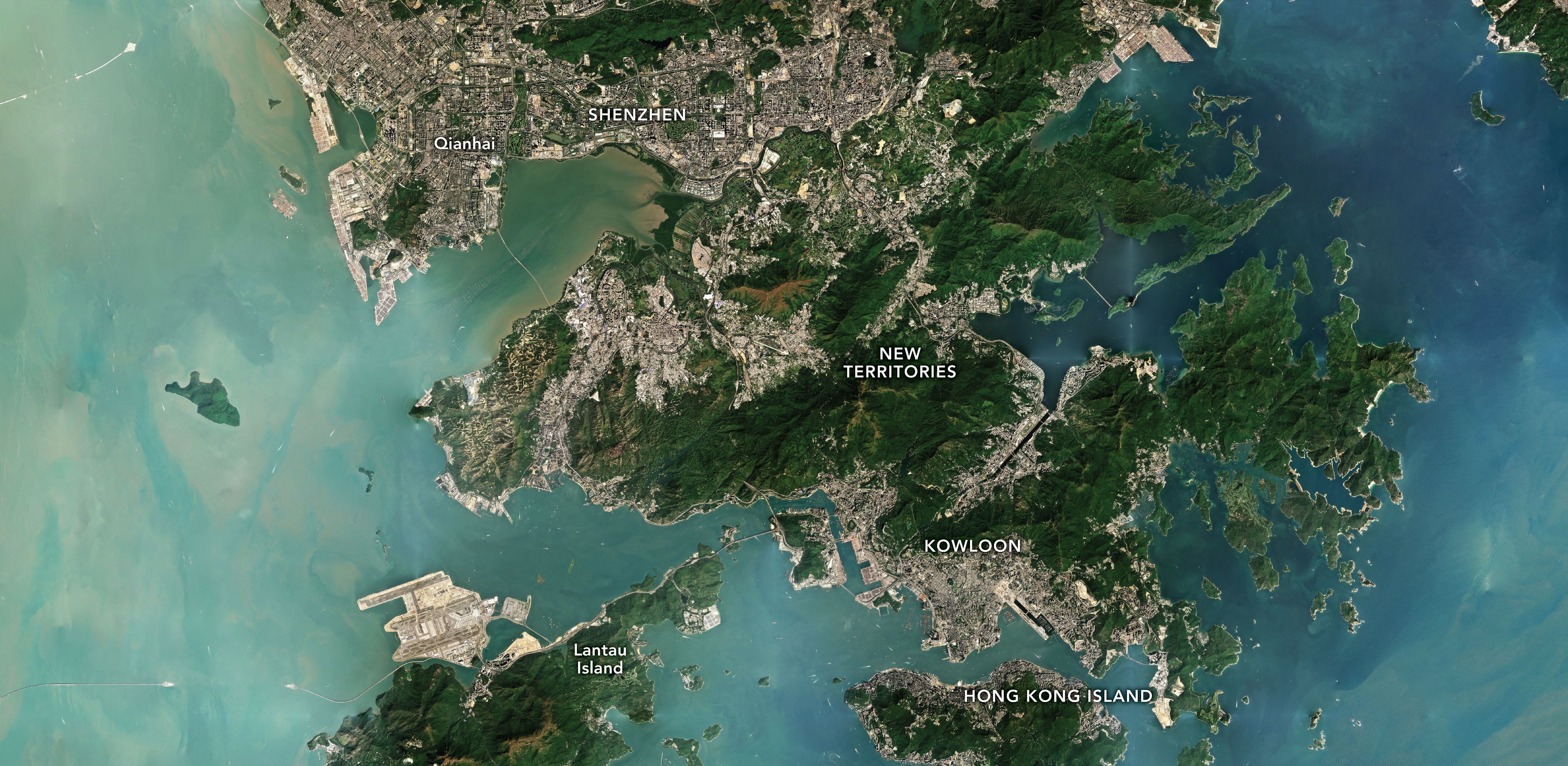 Today, the focal point of the effort to merge Hong Kong with its neighbours is Shenzhen, once a fishing village (seen on the horizon here) that has transformed into a megacity fueled by the growth of technology giants such as Huawei Technologies and Tencent Holdings.