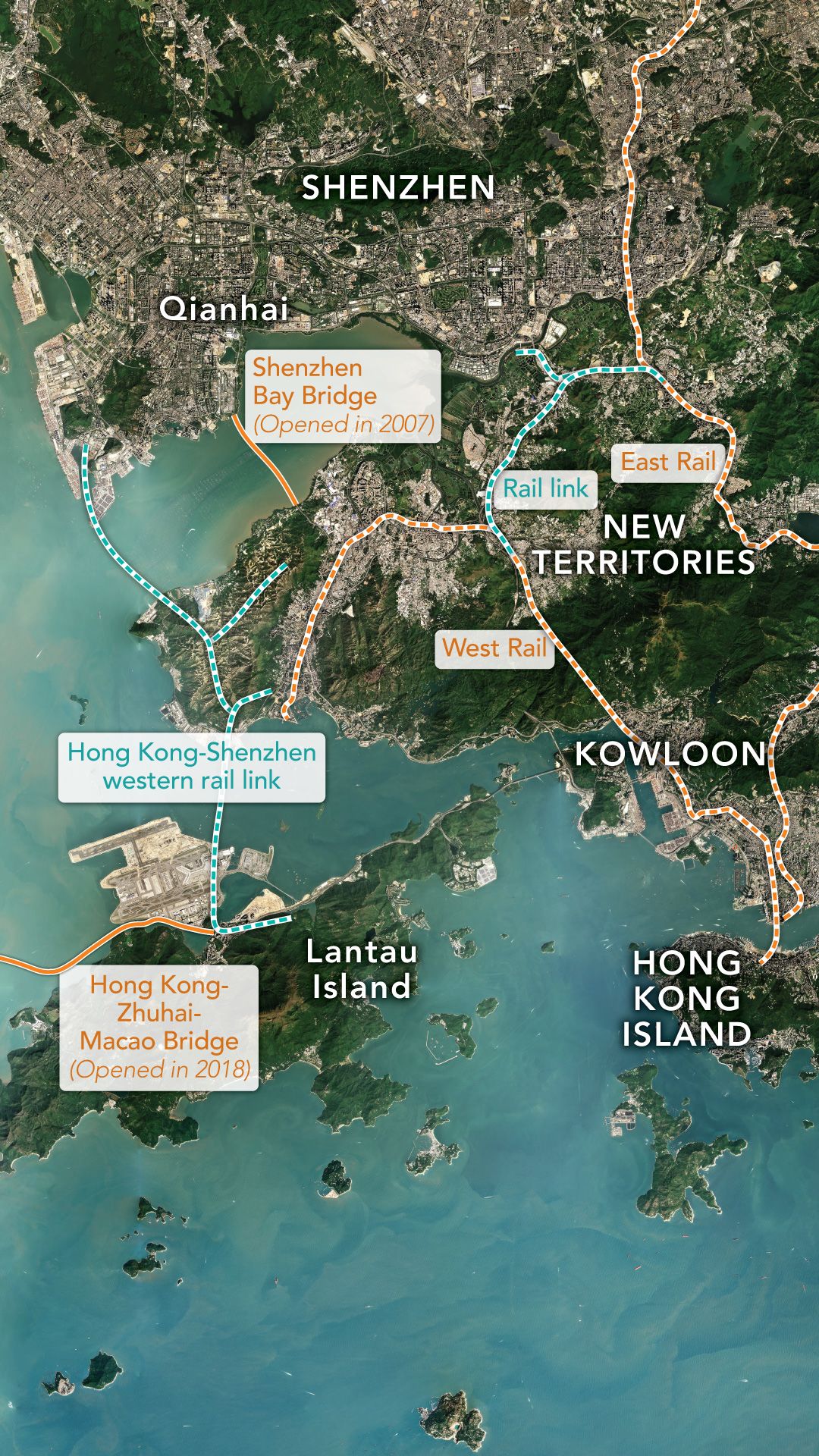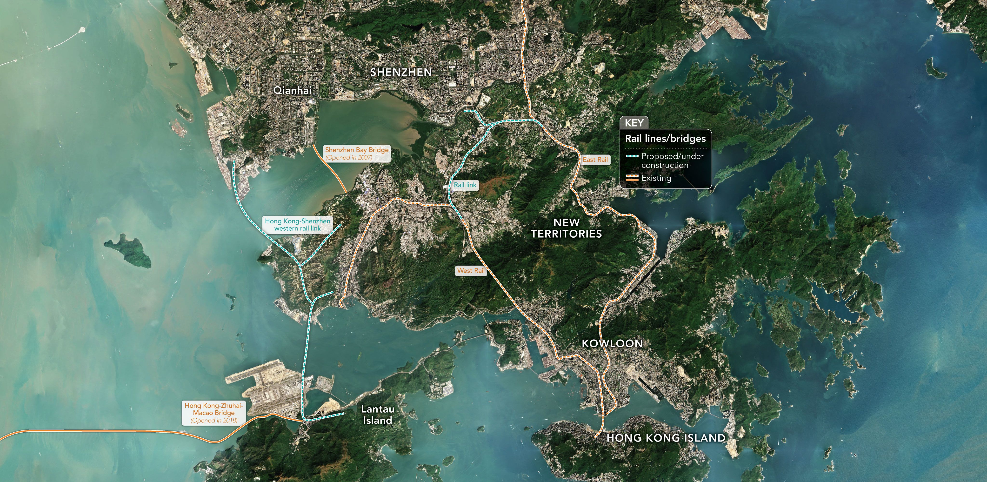 The new infrastructure has brought development and wealth to an ever wider radius around both cities. However, it also appears aimed at shifting the center of commercial activity and decision-making, which has traditionally been with Hong Kong Island, northward.