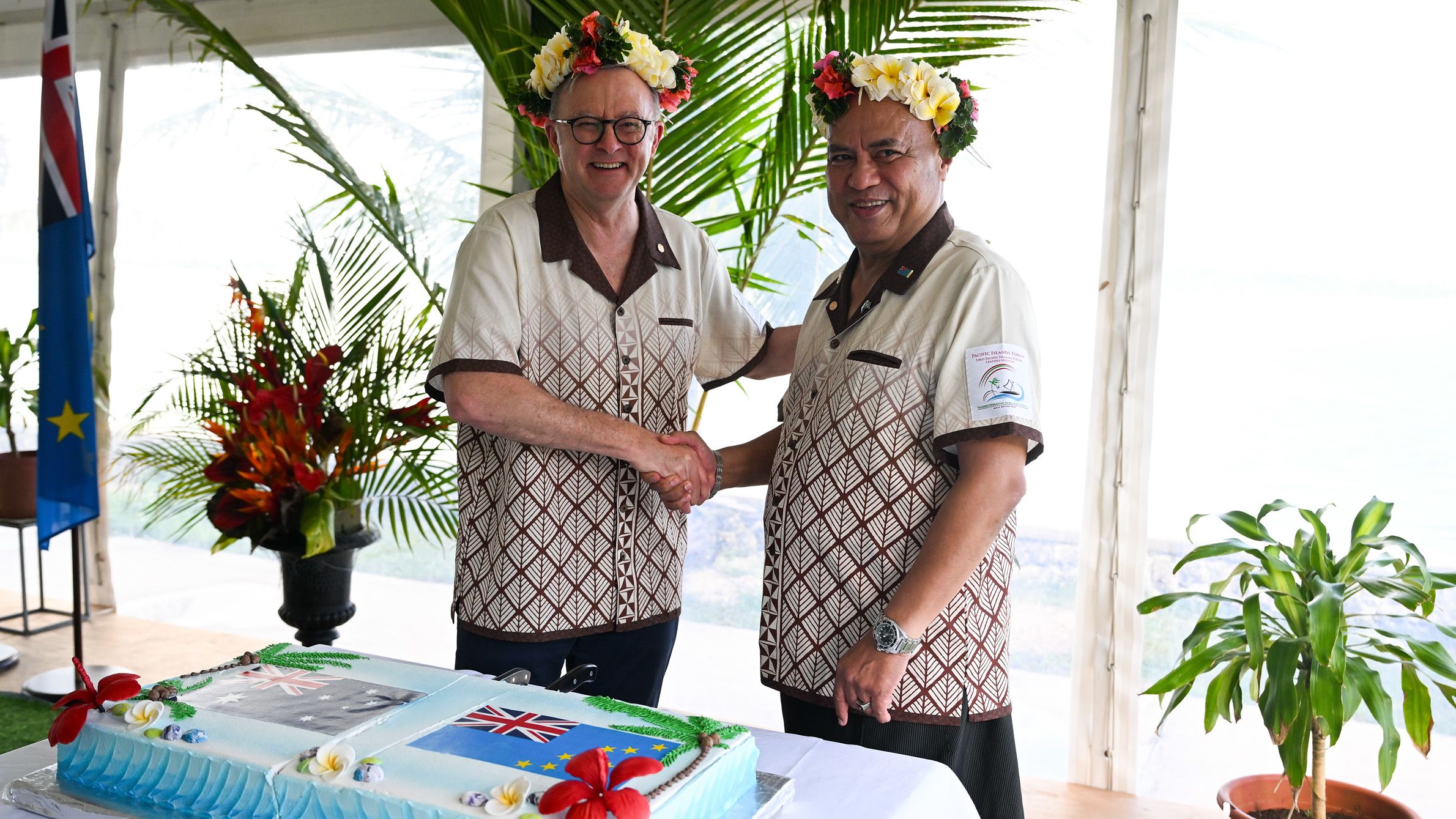 Australian Prime Minister Anthony Albanese, left, with Tuvaluan Prime Minister Feleti Teo in 2024 after signing agreements to bring the Falepili Union into force. (AAP)
