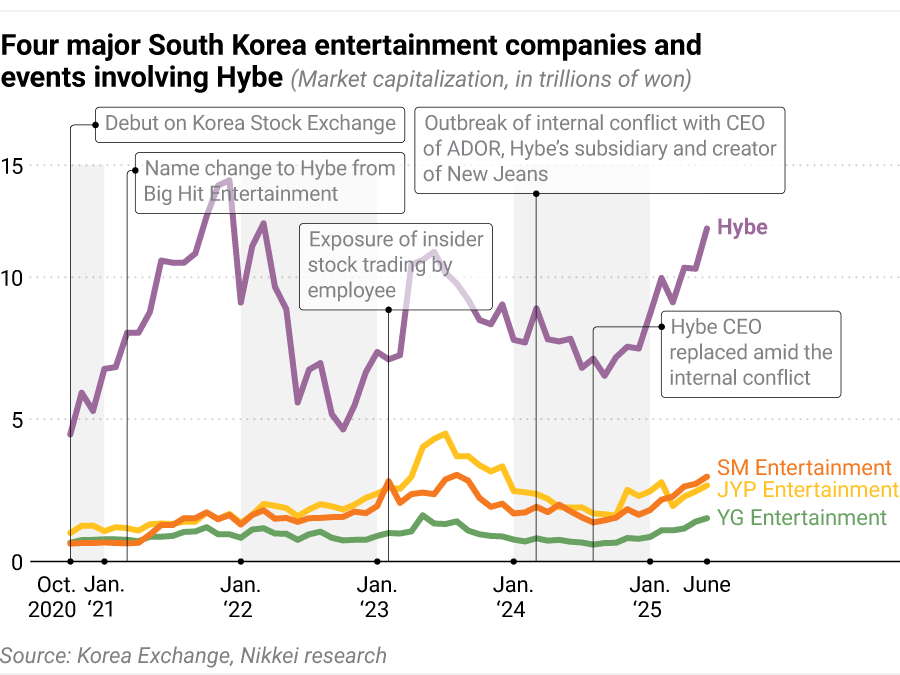South Korea's entertainment industry has long been dominated by four major agencies: Hybe, JYP Entertainment, SM Entertainment and YG Entertainment. While earnings have generally increased since the 2010s, their financial performance and stock prices remain volatile, often influenced by artists' activities and scandals, as well as shifts in public perception of entertainment agencies