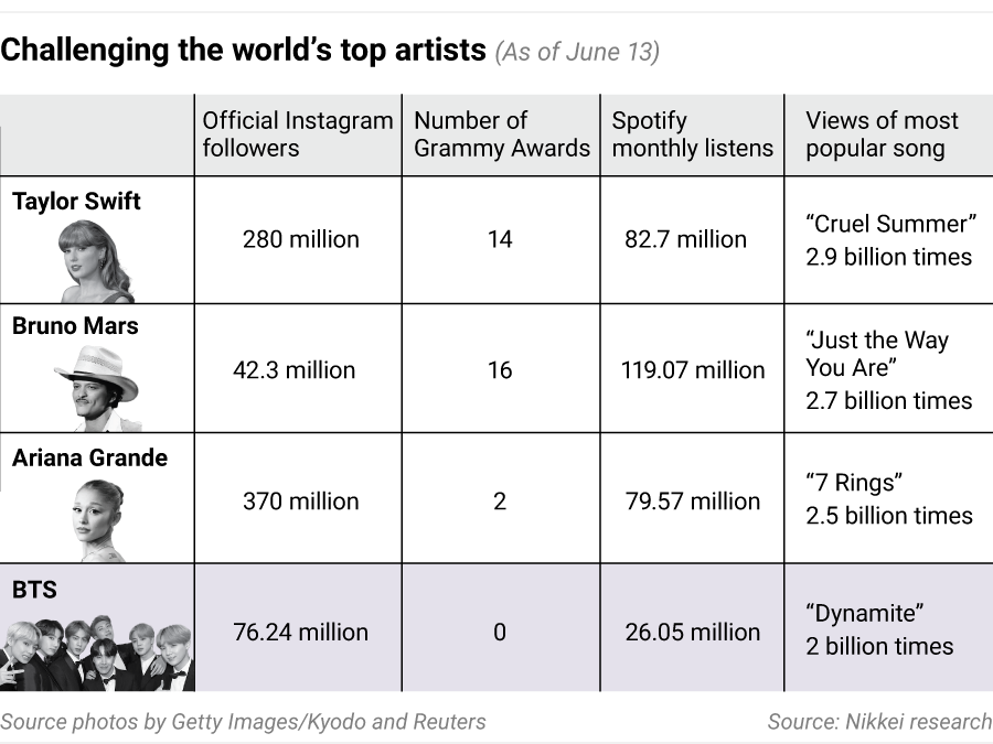 As the members embark on their second chapter as a reunited group, the key question is whether BTS 2.0 can narrow the gap with global superstars like Taylor Swift, who generated over $2 billion in ticket sales from her two-year tour, and Bruno Mars, a 16-time Grammy Award winner.