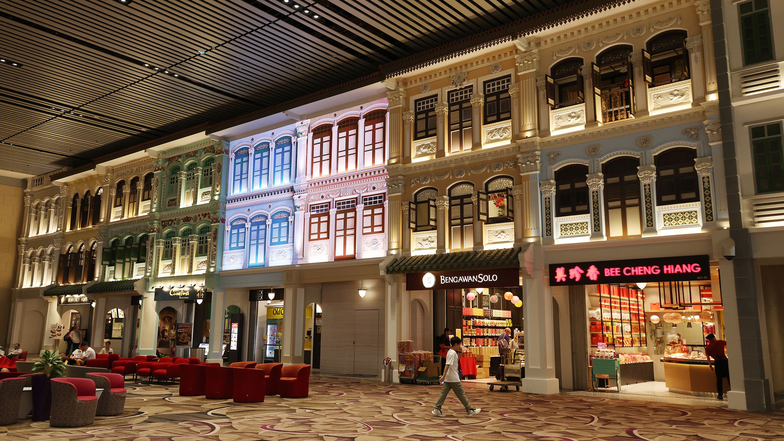 The Heritage Zone in Terminal 4 is a row of brightly colored shop houses modeled after those found in Singapore’s Katong and Joo Chiat districts. (Photo by Shinya Sawai)