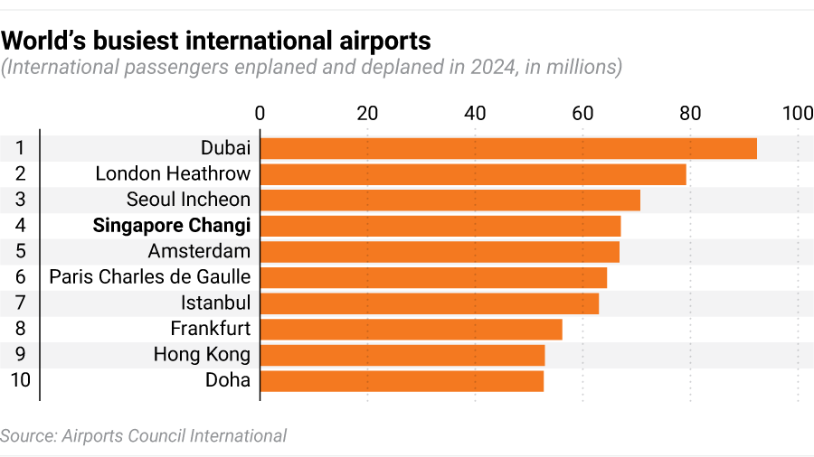 Despite headwinds, Changi remains a global heavyweight. In 2024, it ranked fourth worldwide for international passenger traffic, trailing only Dubai, London Heathrow, and South Korea’s Incheon. While competition from Hong Kong and Doha is rising, analysts say Singapore’s efficient operations and cohesive policymaking continue to give it an edge.