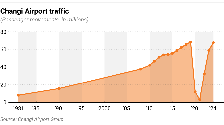 Today, Changi connects to over 170 cities and is served by about 100 airlines. Annual passenger traffic has risen from 8 million in 1981 to nearly 68 million in 2024.