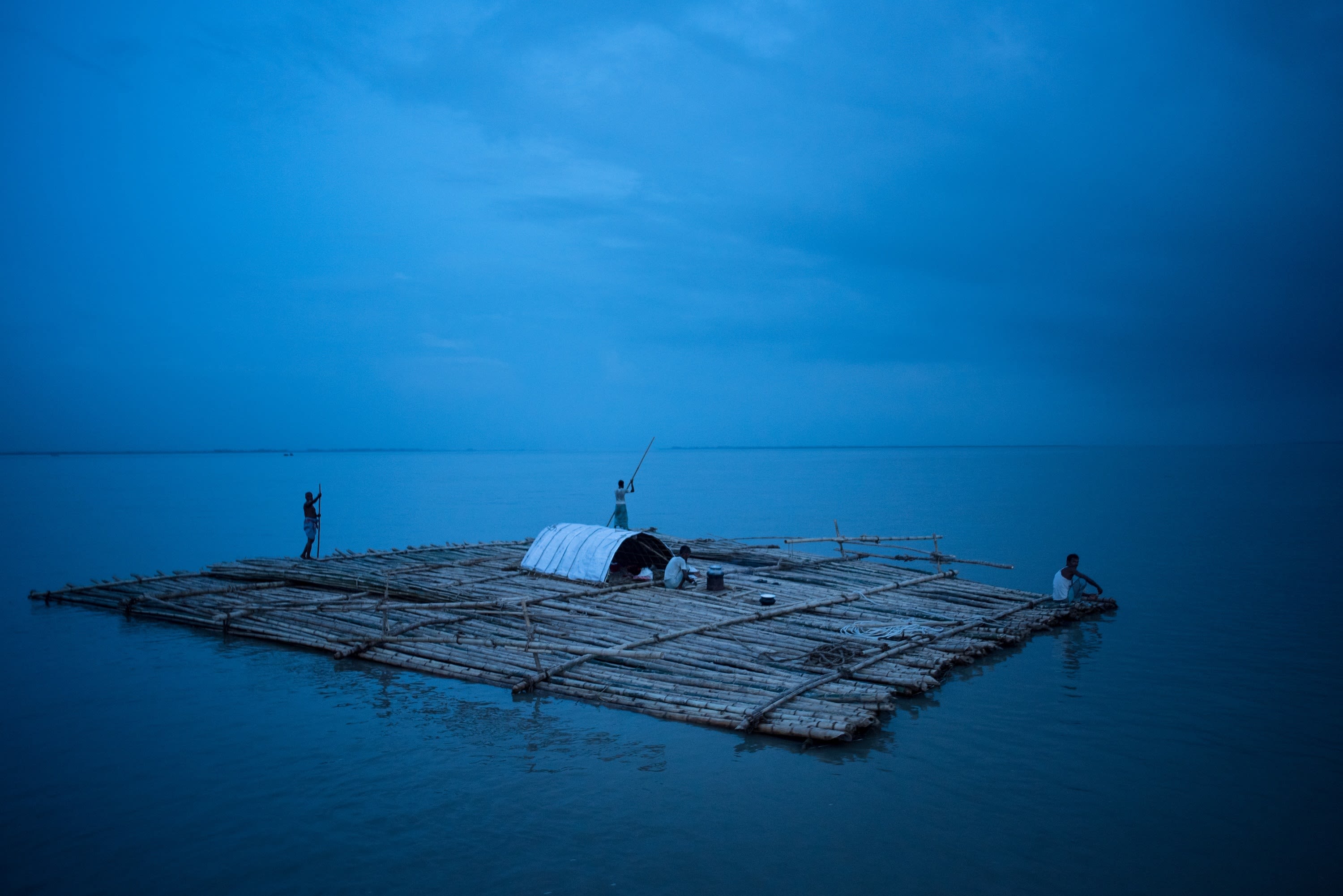 Buddheswar Morang wipes the sweat off his face, sitting in his two-room flood-resilient mud hut perched on bamboo stilts. The height of these makeshift homes by the Brahmaputra and its tributaries in Northeastern India can change every year, depending on the previous year’s flood water level — the higher the waters, the more elevated the home. Some hang their bedsteads from rafters to sleep a few inches above the floor, which still runs the risk of getting flushed.
