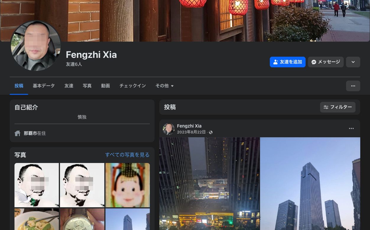 A Facebook page for "Fengzhi Xia." Some parts of this image have been obscured.