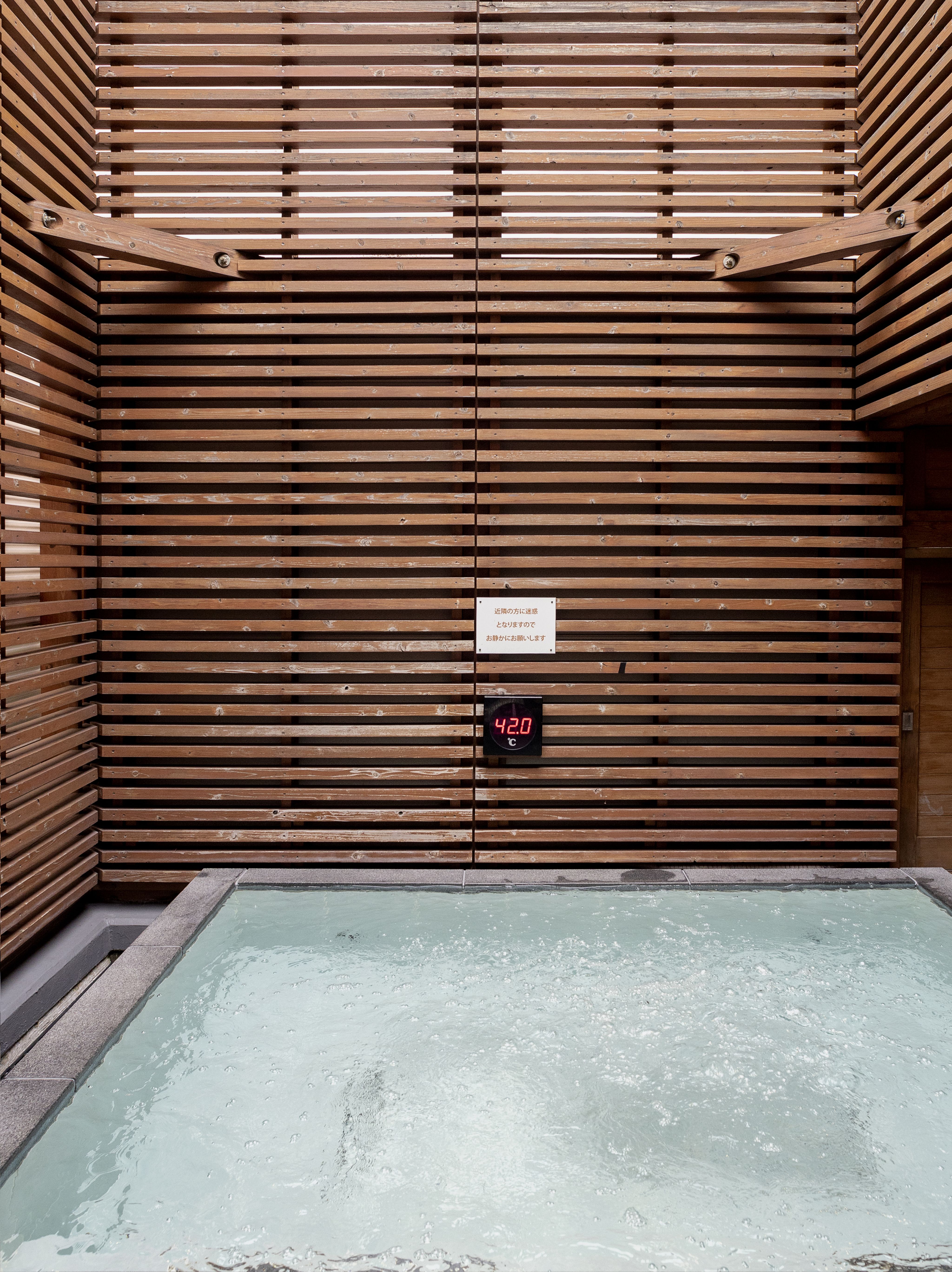 Up another set of stairs is a terrace with an outside bath. Protected from prying eyes by a tall wooden structure that allows bathers to look up at the sky, this rotenburo (open-air bath) is a unique experience. The tranquilty of a soak in the crystal-clear pool is broken every few minutes by the gentle thud of a train passing by just meters away. The weather is not an issue (a day before my recent visit, the terrace stayed open during a typhoon — something this writer wants to experience).