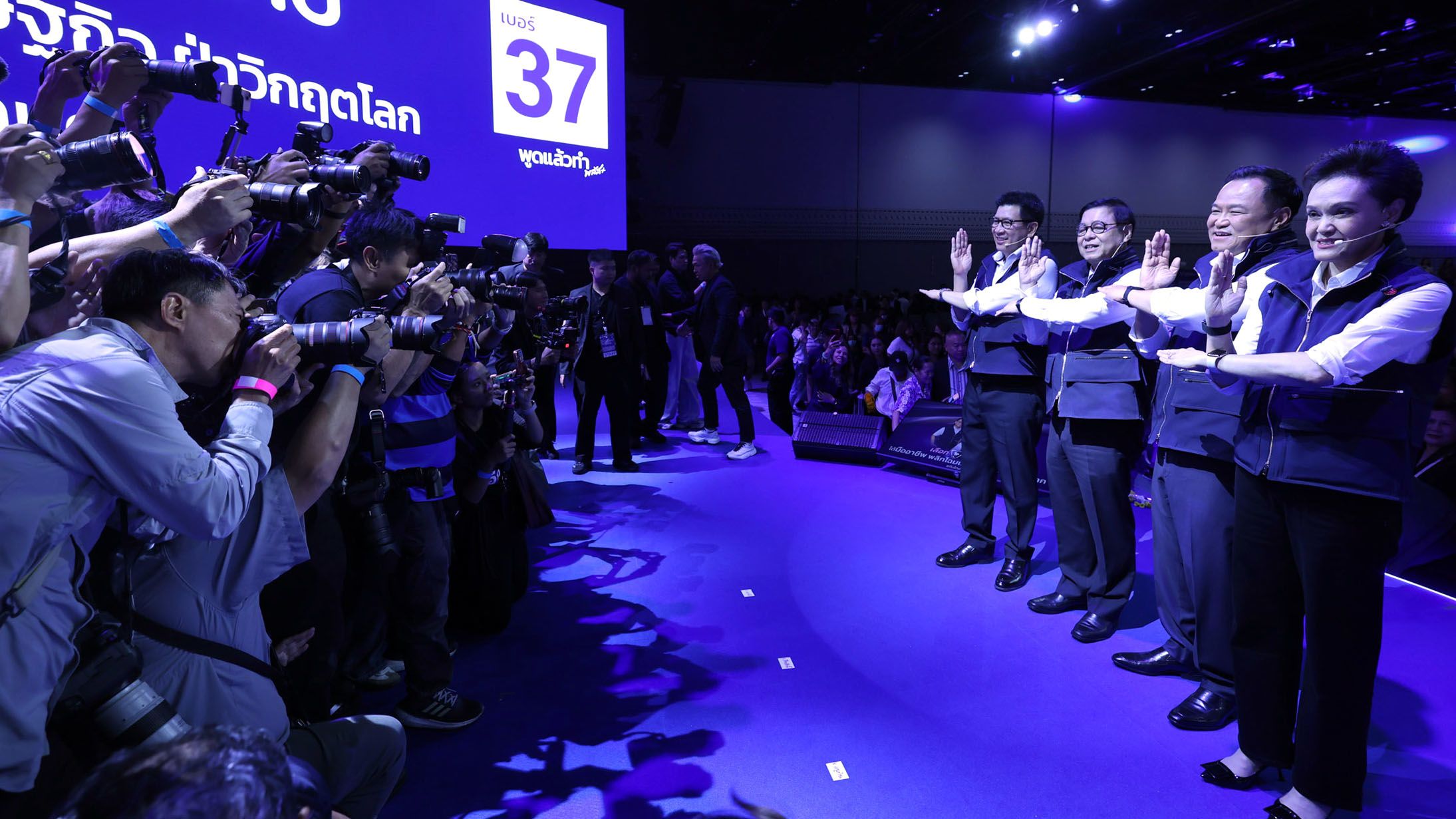 Bhumjaithai Party leader Anutin Charnvirakul, second from right, poses during an election campaign rally in Bangkok on Feb. 6. (Photo by Ken Kobayashi)