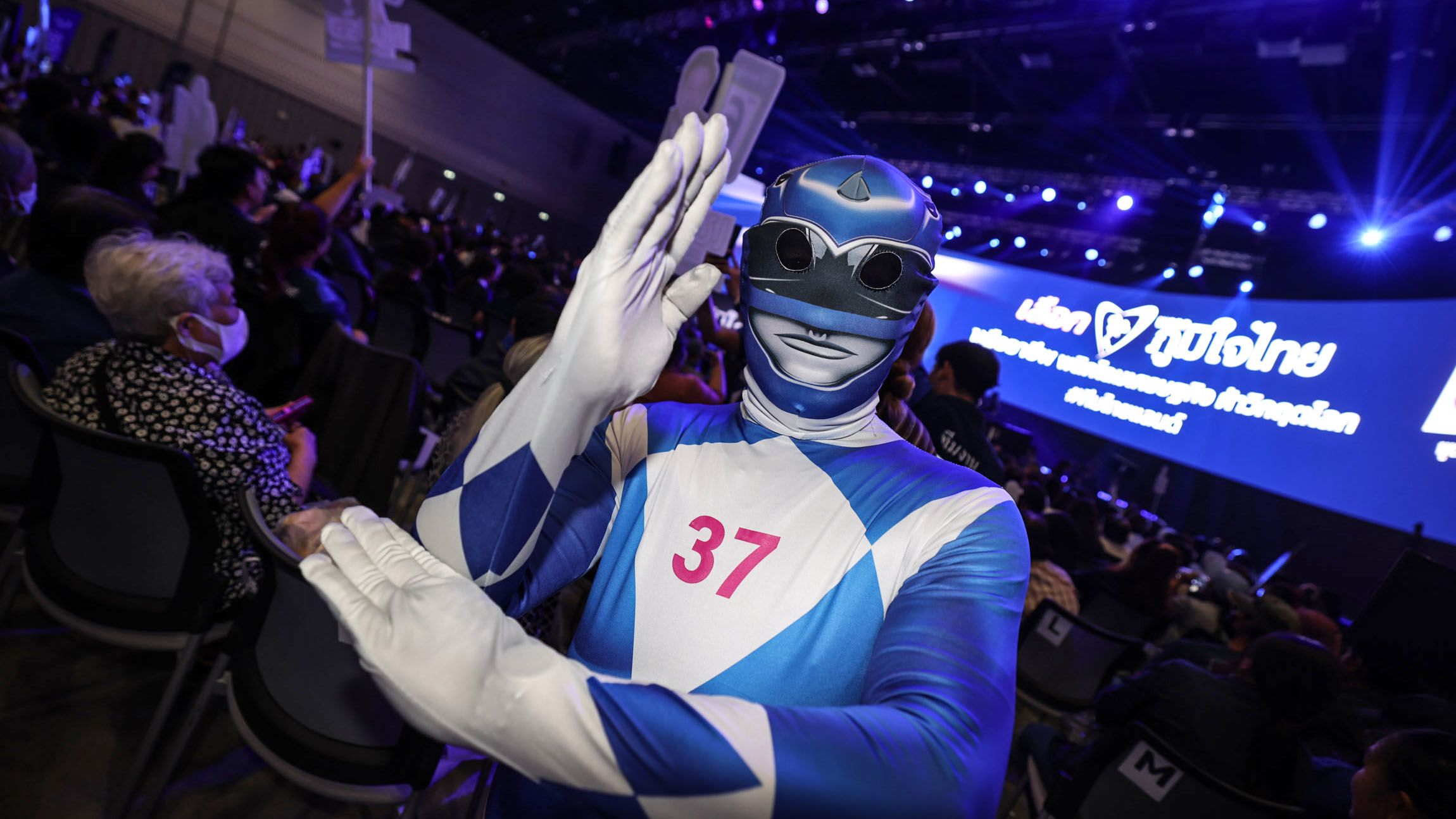 A person wearing a costume poses during Bhumjaithai Party campaign rally in Bangkok on Feb. 6. (Photo by Ken Kobayashi)