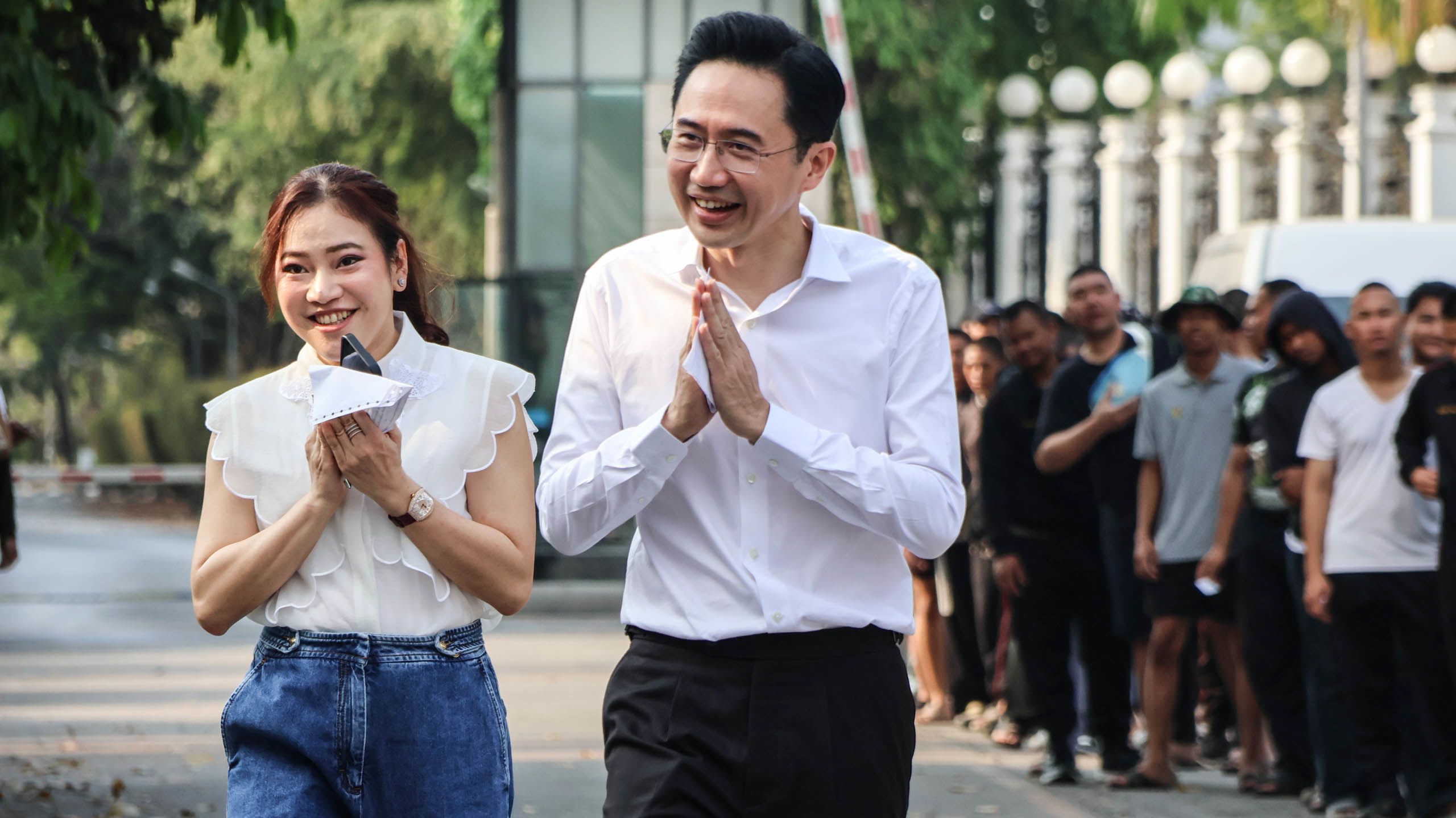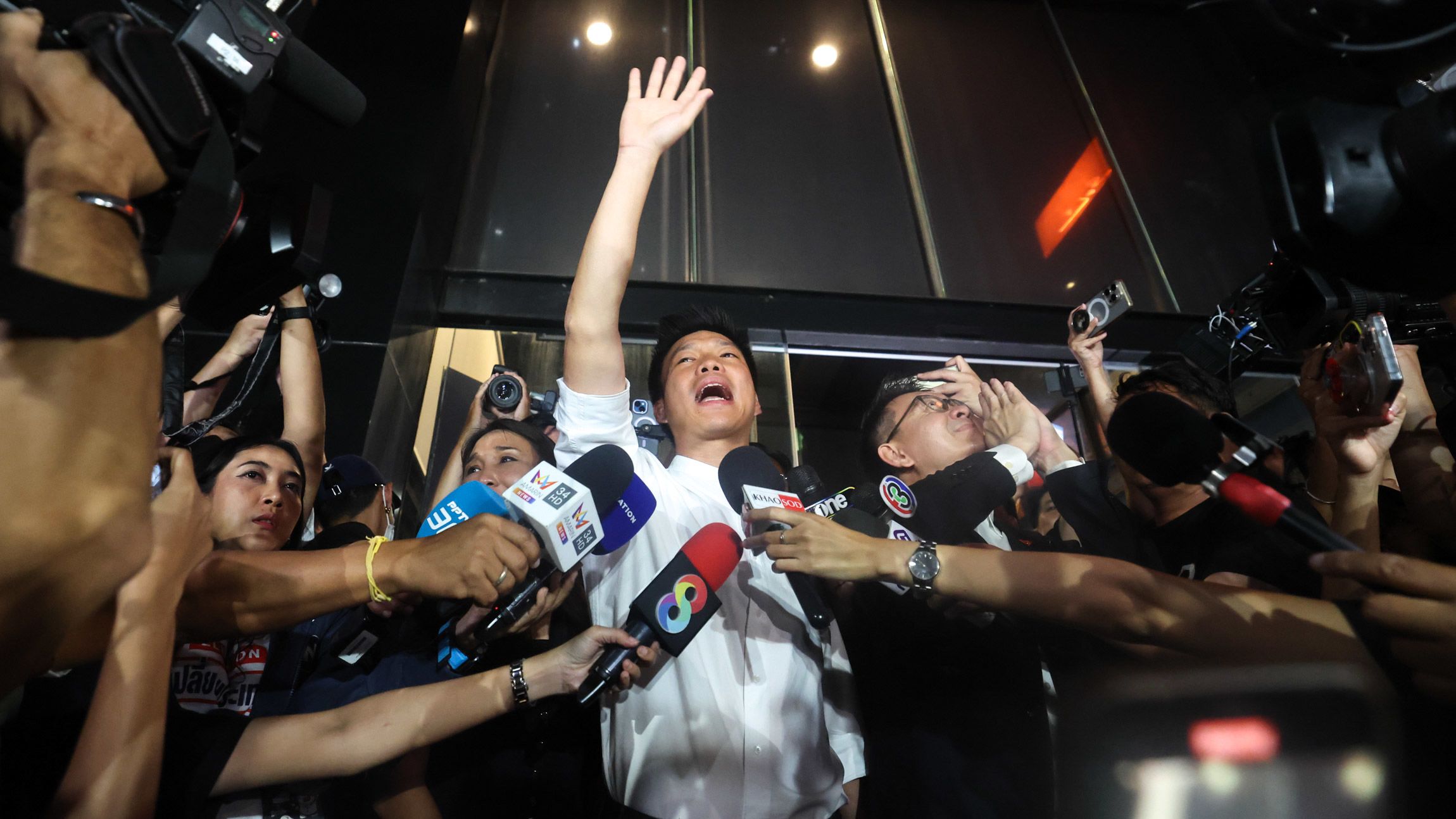 People's Party leader Natthaphong Ruengpanyawut waves to supporters as he leaves the party's headquarters on Feb. 8. (Photo by Ken Kobayashi)
