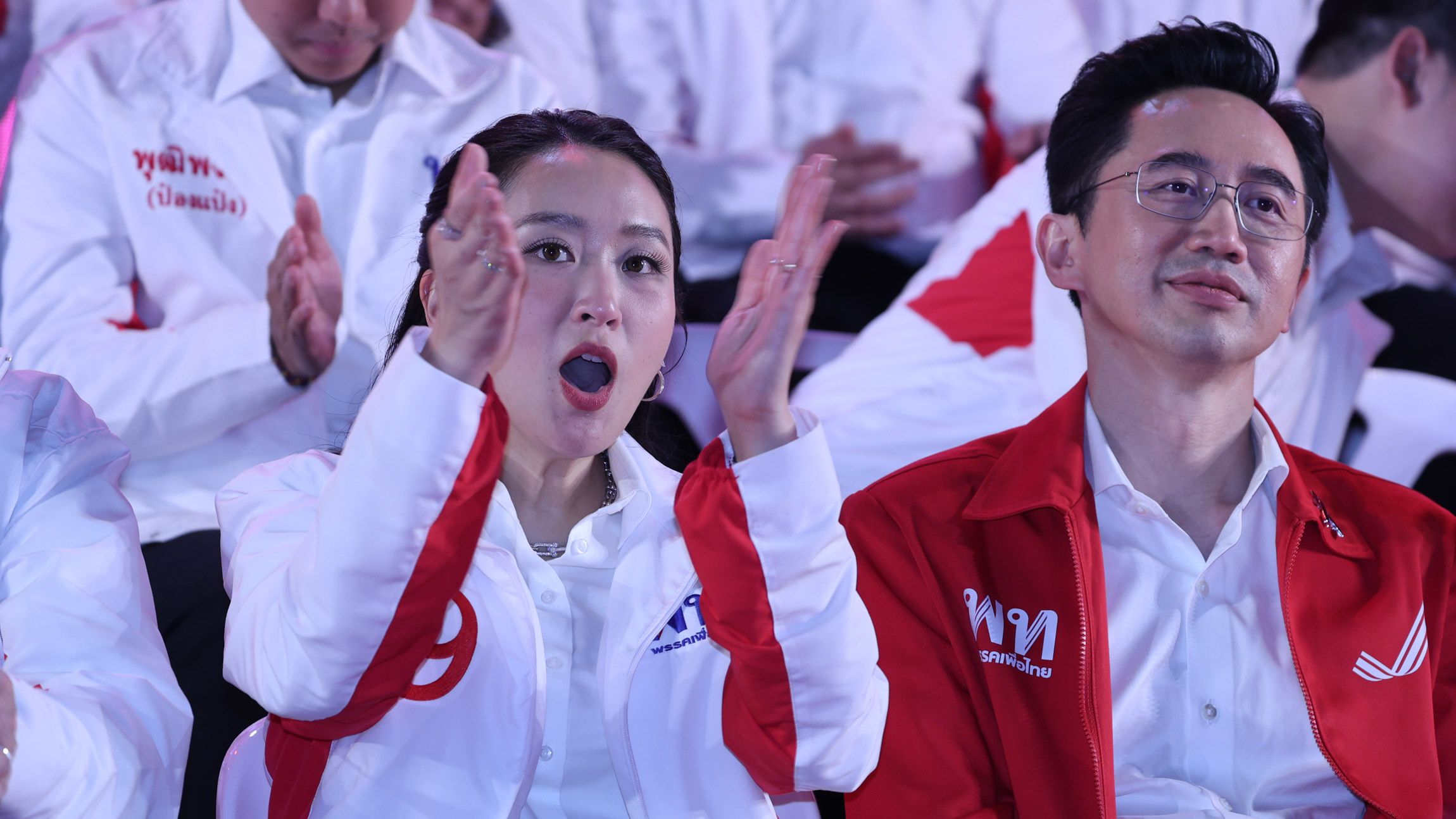 Former Prime Minister Paetongtarn Shinawatra, left, and Pheu Thai Party prime ministerial candidate Yodchanan Wongsawat attend a campaign rally in Bangkok on Jan. 8. (Photo by Ken Kobayashi)