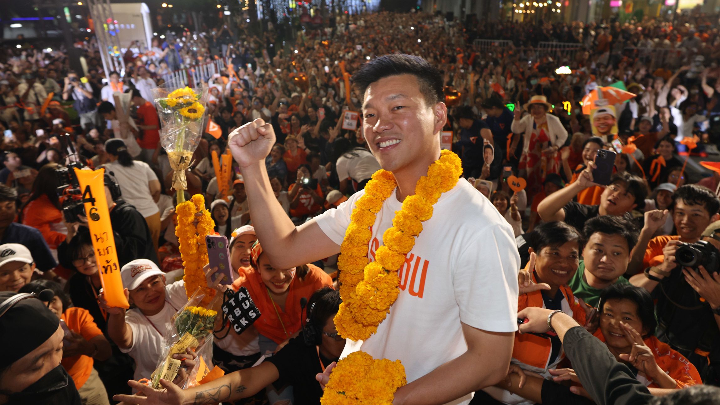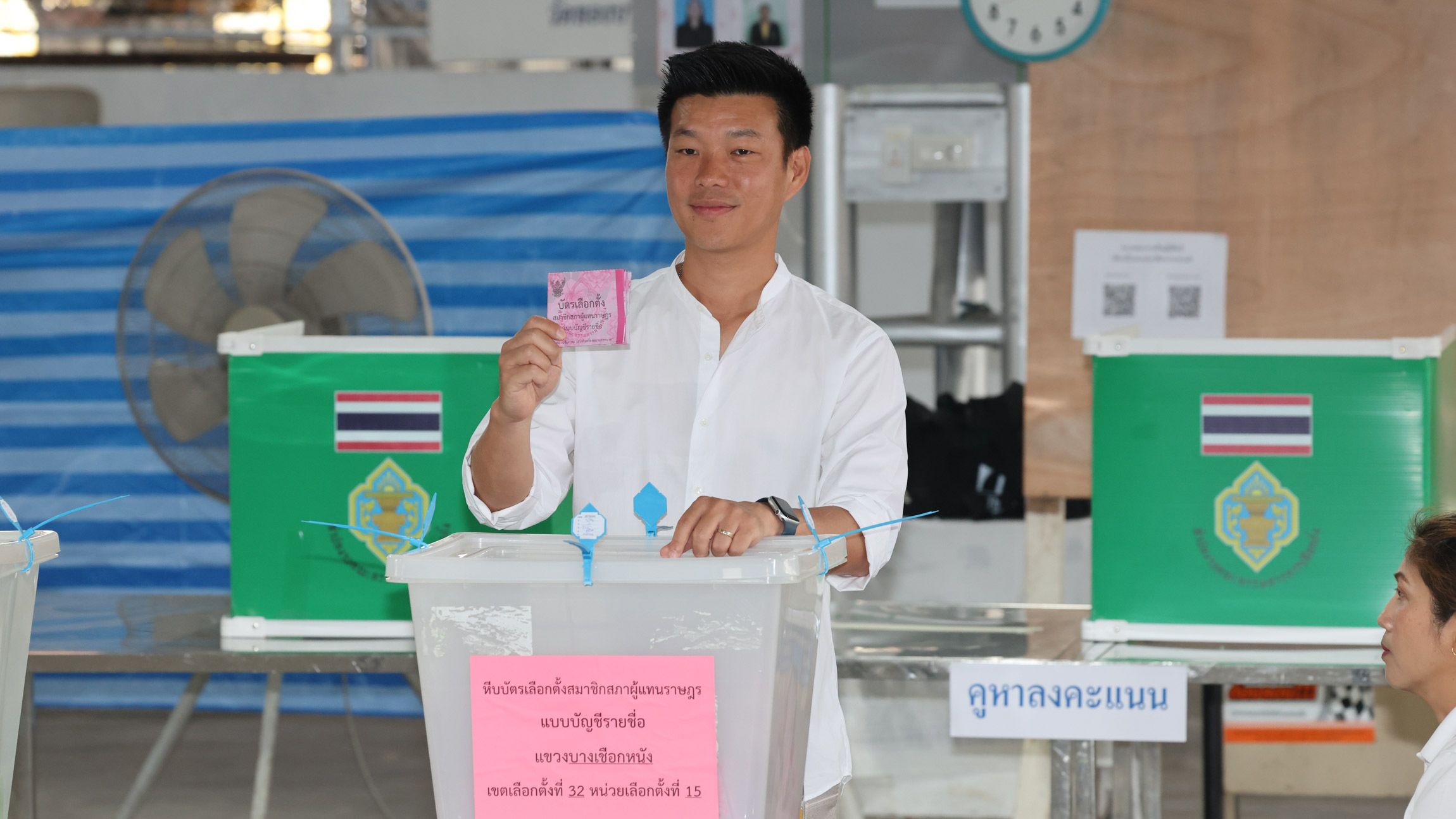 Natthaphong Ruengpanyawut, the People's Party leader and prime ministerial candidate, casts his ballot in Bangkok. (Photo by Ken Kobayashi)