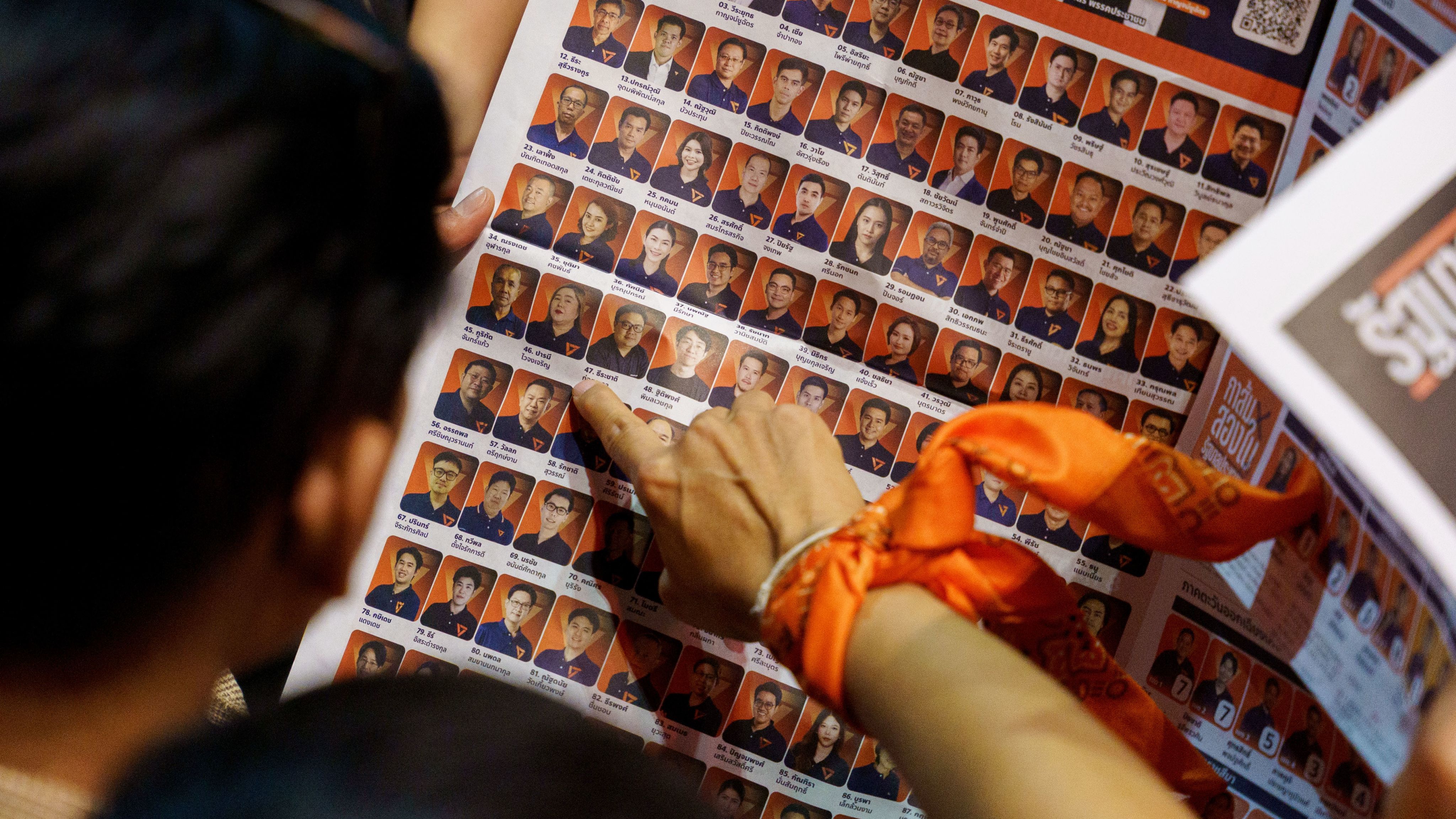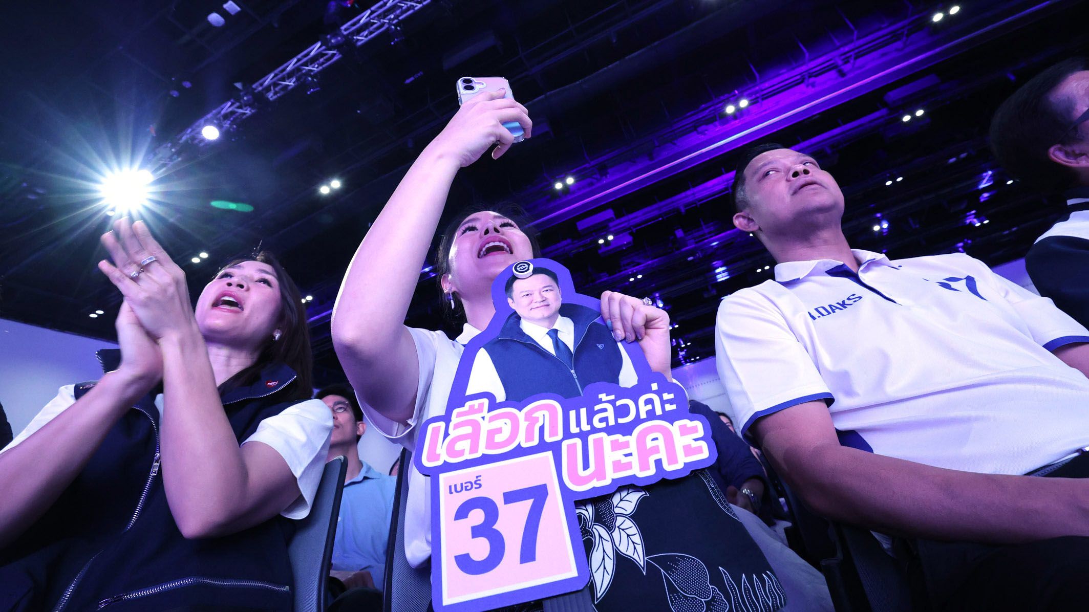 A supporter points to the candidate list during a People’s Party campaign rally in Bangkok on Feb. 6. (Photo by Thomas Cristofoletti)