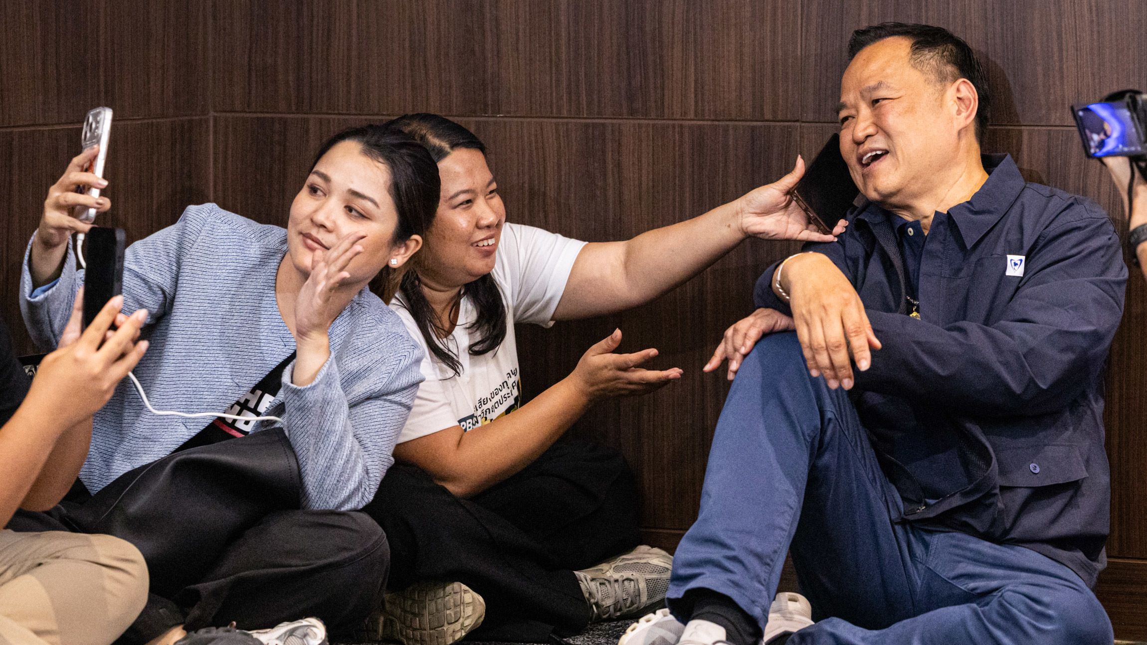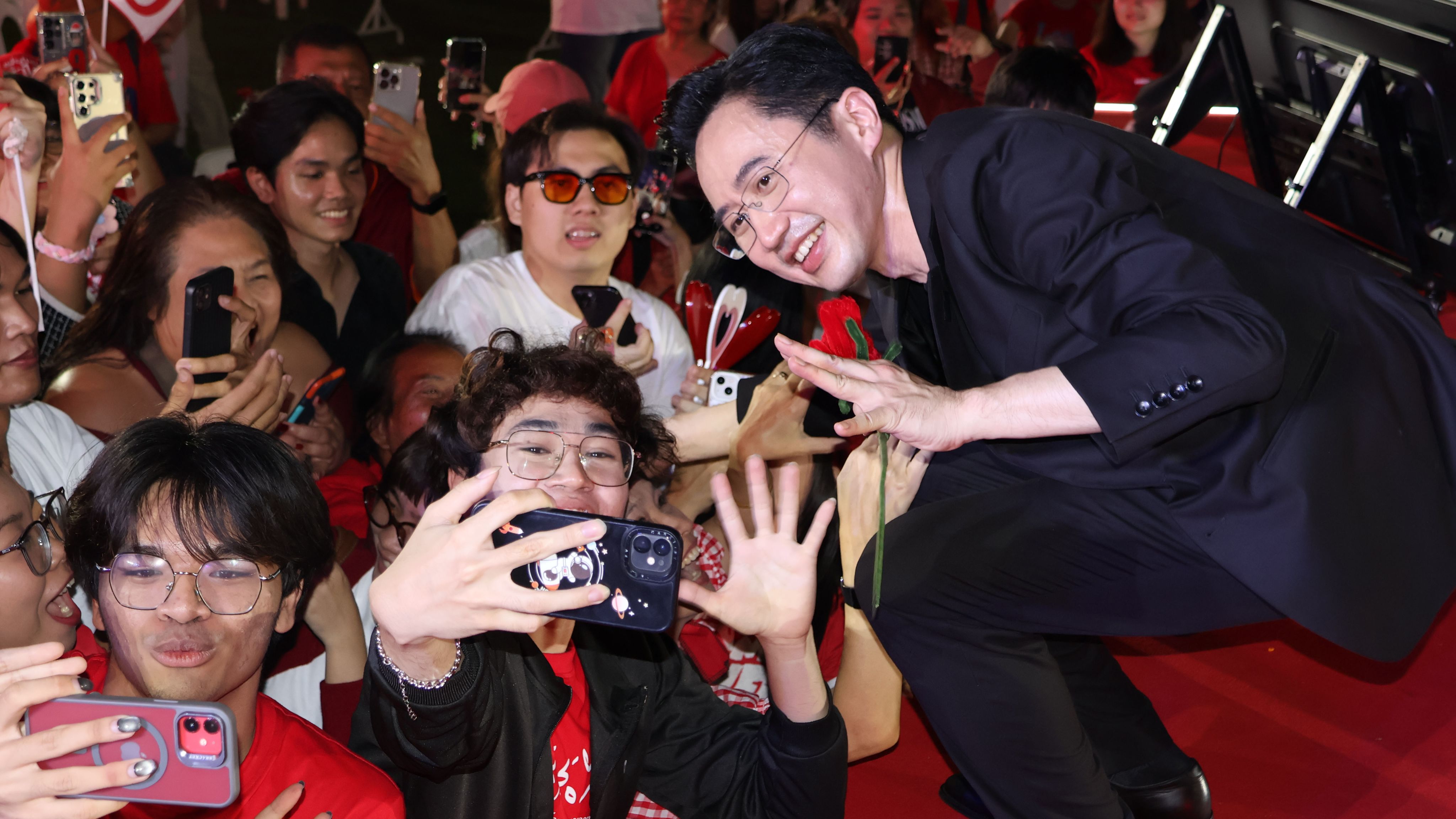 Pheu Thai Party prime ministerial candidates Yodchanan Wongsawat poses for photos with supporters during a campaign rally in Bangkok on Feb. 6. (Photo by Yuka Konishi)