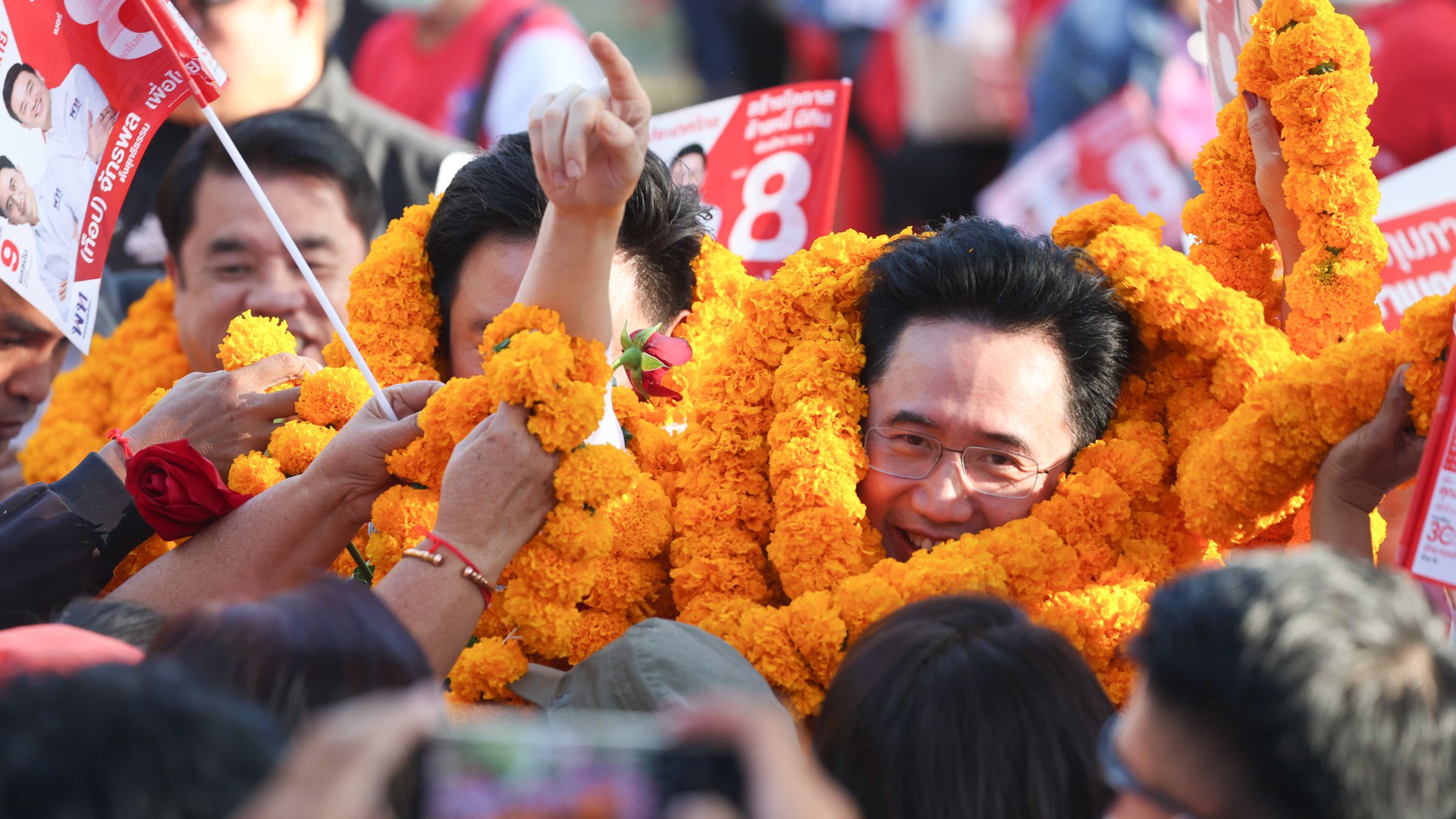 Supporters of Pheu Thai Party prime ministerial candidate Yodchanan Wongsawat place garlands of marigolds around his neck at a campaign rally in Chiang Mai on Jan. 9. (Photo by Ken Kobayashi)
