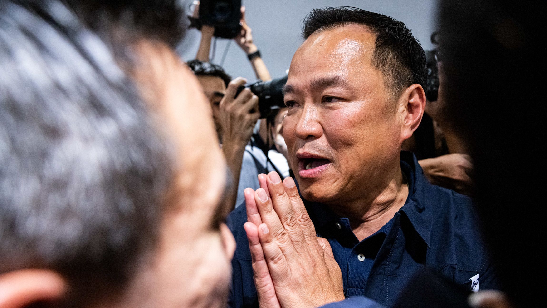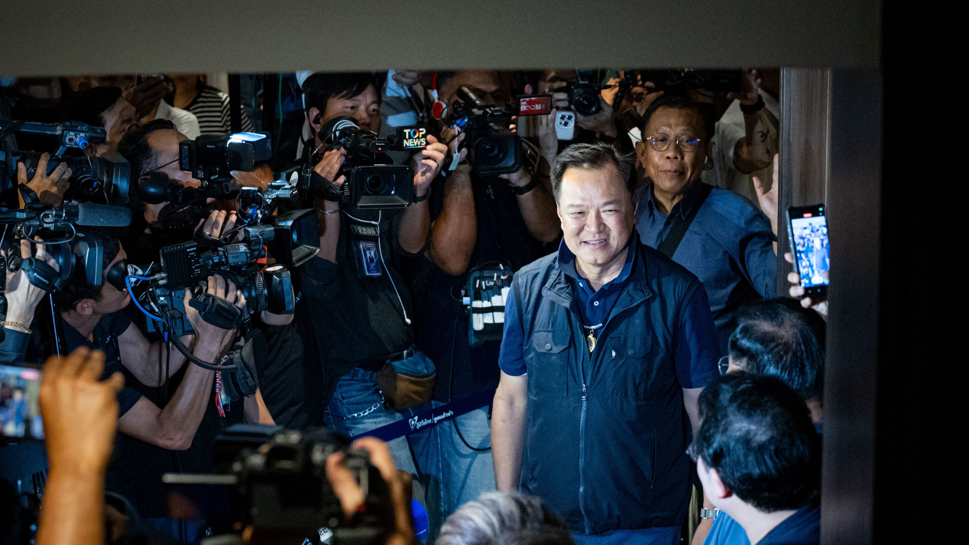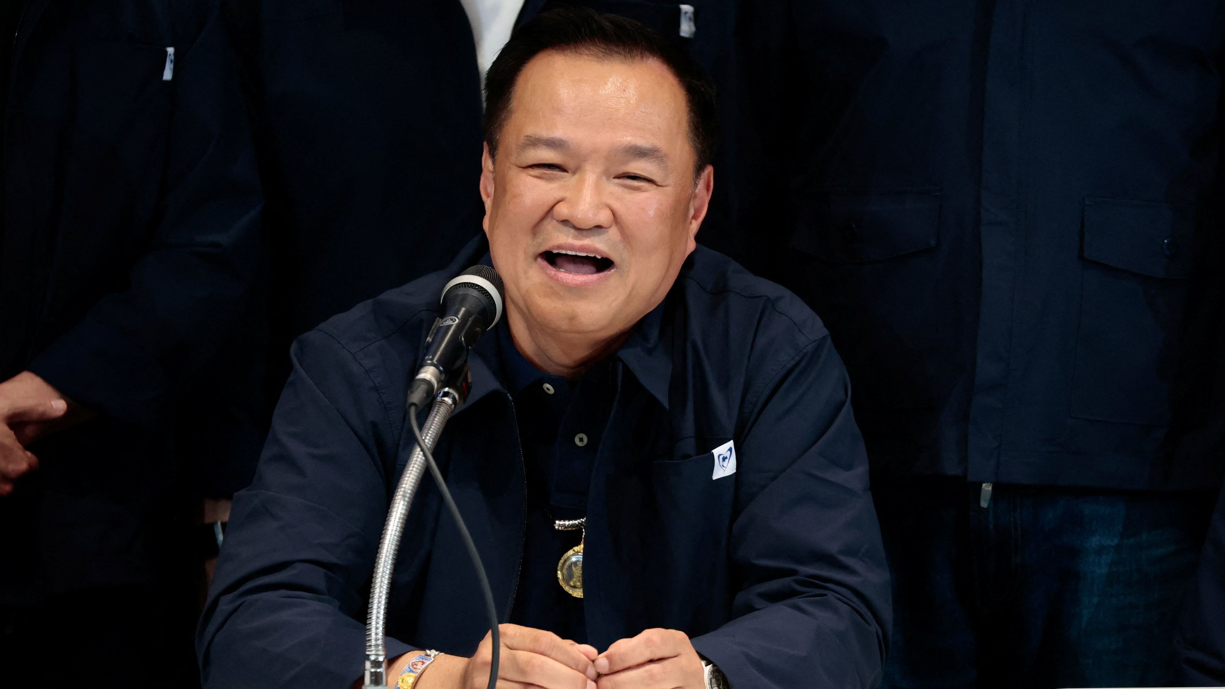 Anutin Charnvirakul speaks to media at Bhumjaithai Headquarters in Bangkok on Feb. 8. (Photo by Lauren DeCicca/Getty Images)
