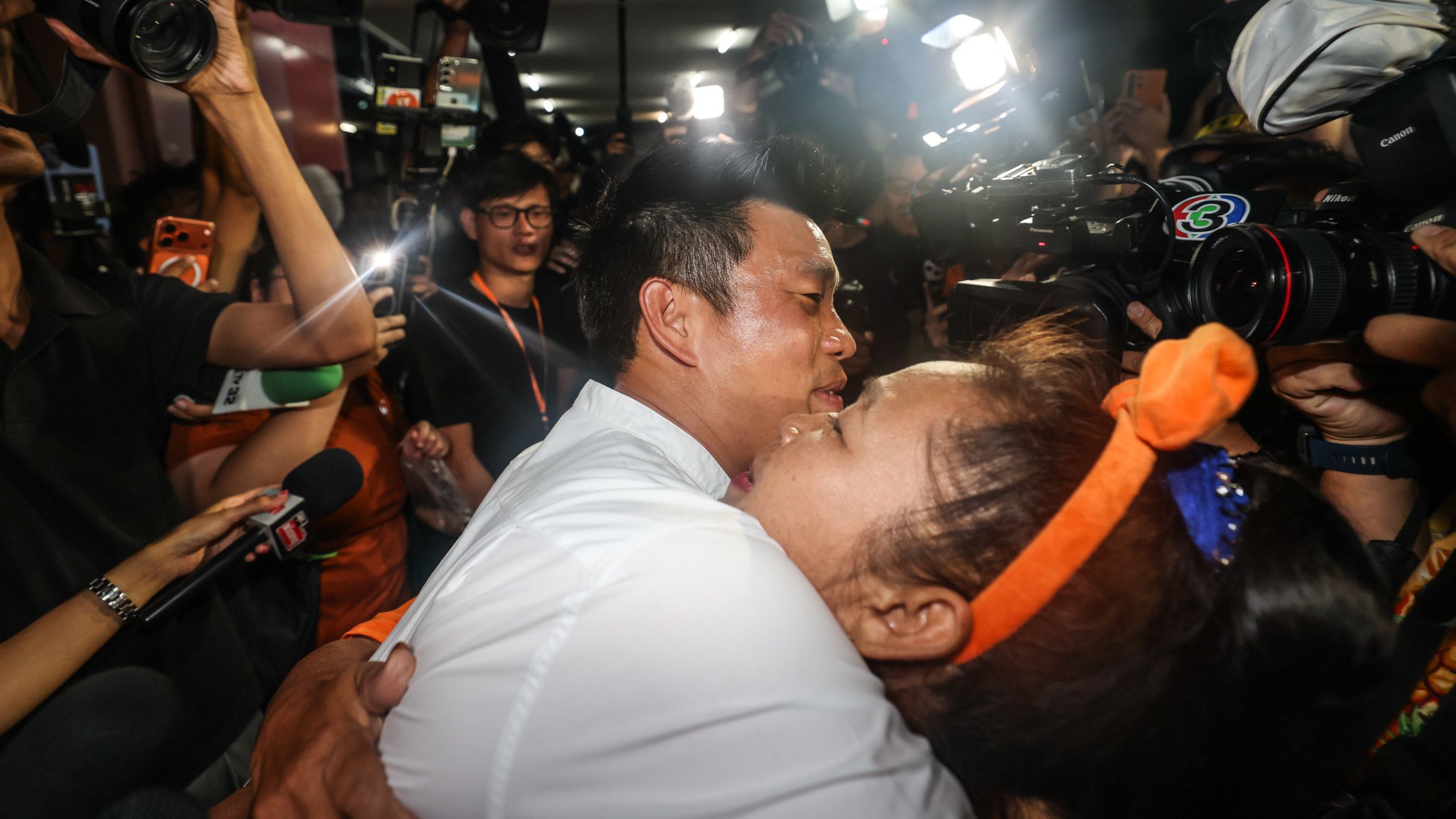 Natthaphong Ruengpanyawut hugs a supporter as he leaves the party’s headquarters on Feb. 8. (Photo by Ken Kobayashi)