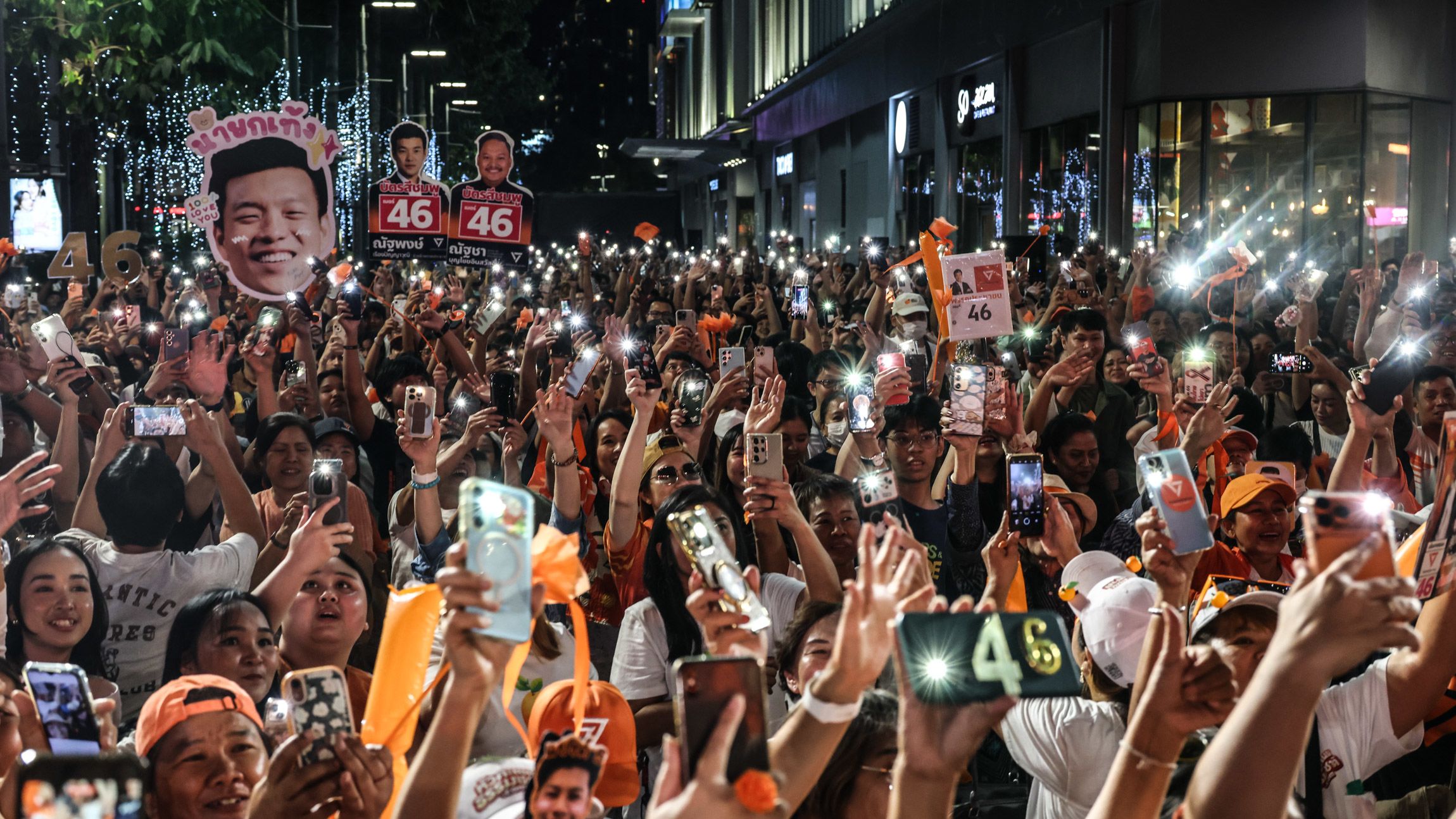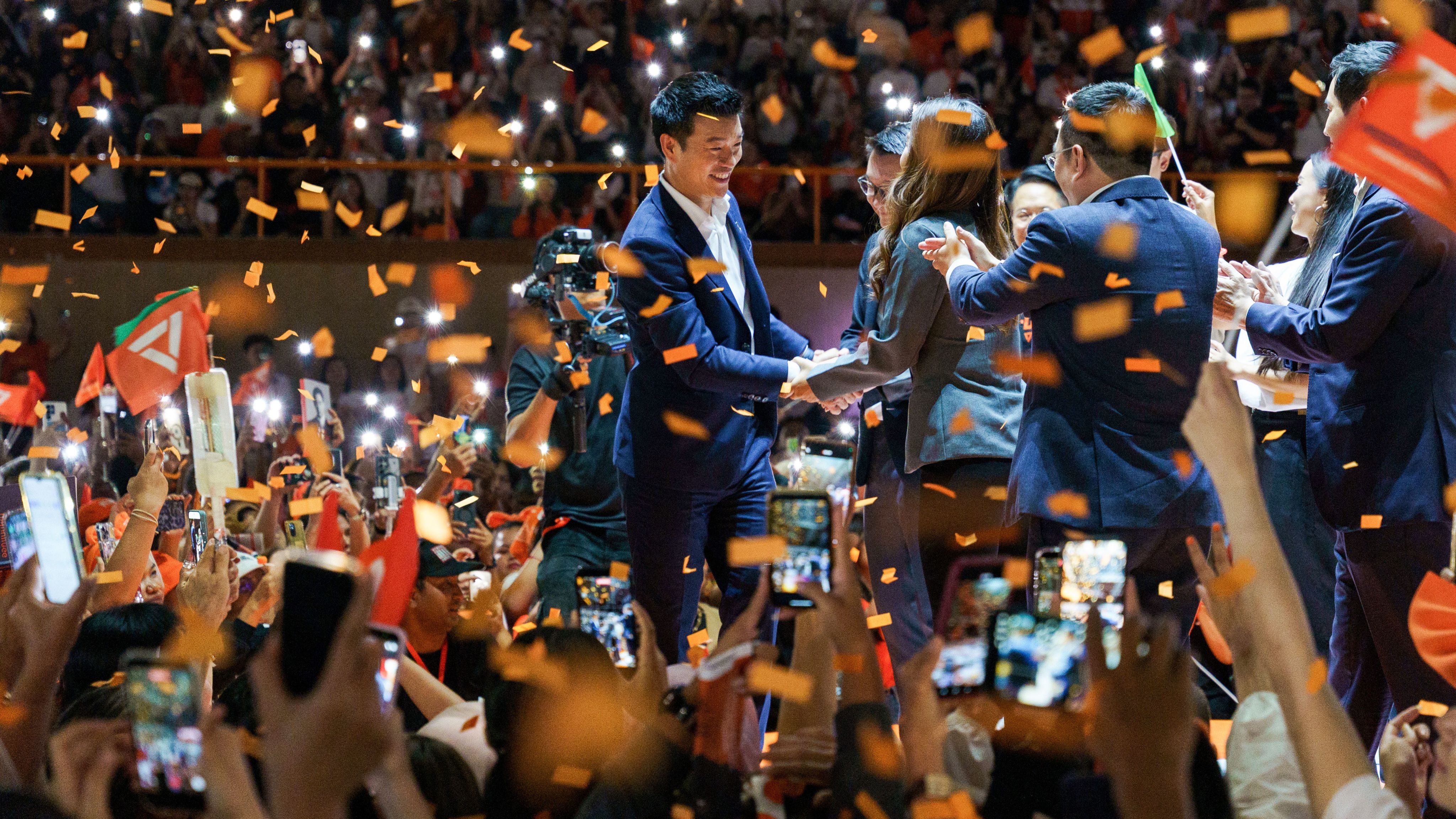 People’s Party leader Natthaphong Ruengpanyawut shakes hands with party members during a campaign rally in Bangkok, on Feb. 6. (Photo by Thomas Cristofoletti)