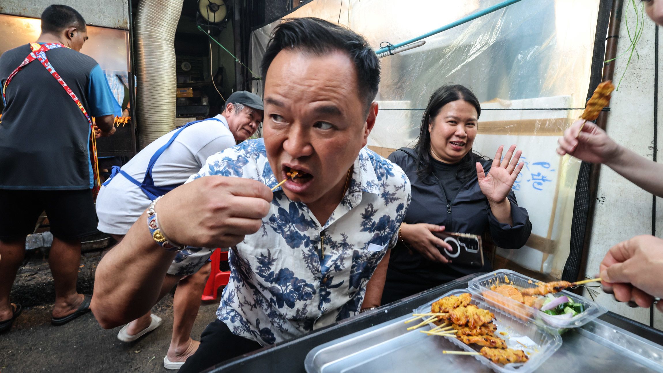 Anutin Charnvirakul eats "moo ping" (Thai-style grilled pork skewers) during a campaign event in Bangkok's Chinatown on Jan. 11. (Photo by Ken Kobayashi)