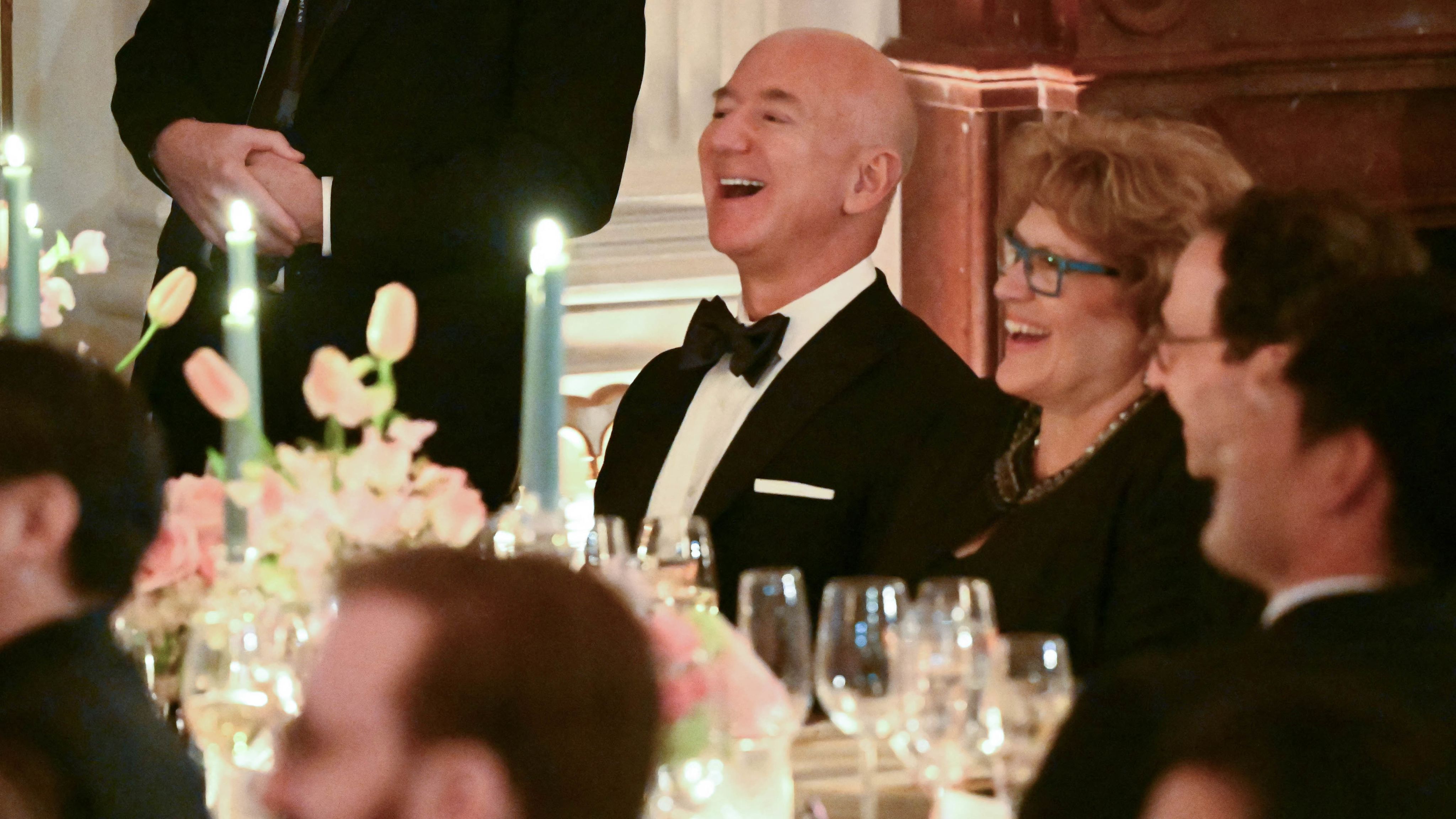 Amazon's Jeff Bezos laughs during dinner. (Photo: AFP/Jiji)
