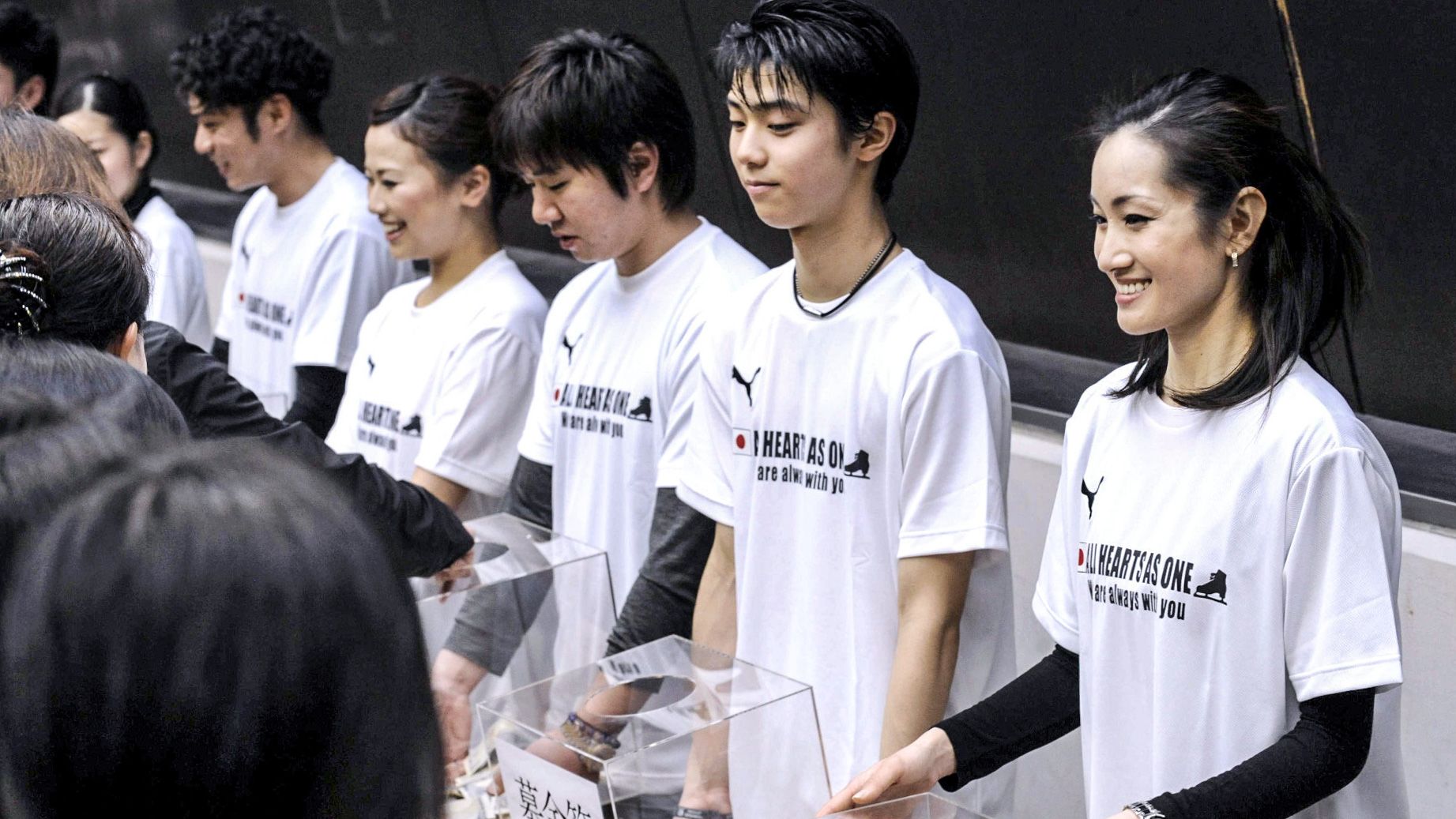 Hanyu was born in Sendai, Miyagi Prefecture, and became an evacuee after his home was damaged by the Great East Japan Earthquake in 2011. Though he considered quitting at the time, he continued figure skating with the support of people around him, and personally contributed to relief efforts in disaster-hit areas. He joined Shizuka Arakawa, right, a Japanese female figure skating Olympic gold medalist, and others to collect donations at the Port Island Sports Center in Kobe, Hyogo Prefecture, on April 9, 2011, a month after the catastrophe.