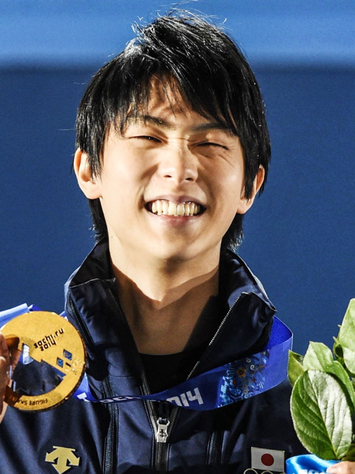Hanyu with his Olympic gold medal for the men’s figure skating singles at the Sochi Winter Olympics in 2014. (Photo by Takaki Kashiwabara)