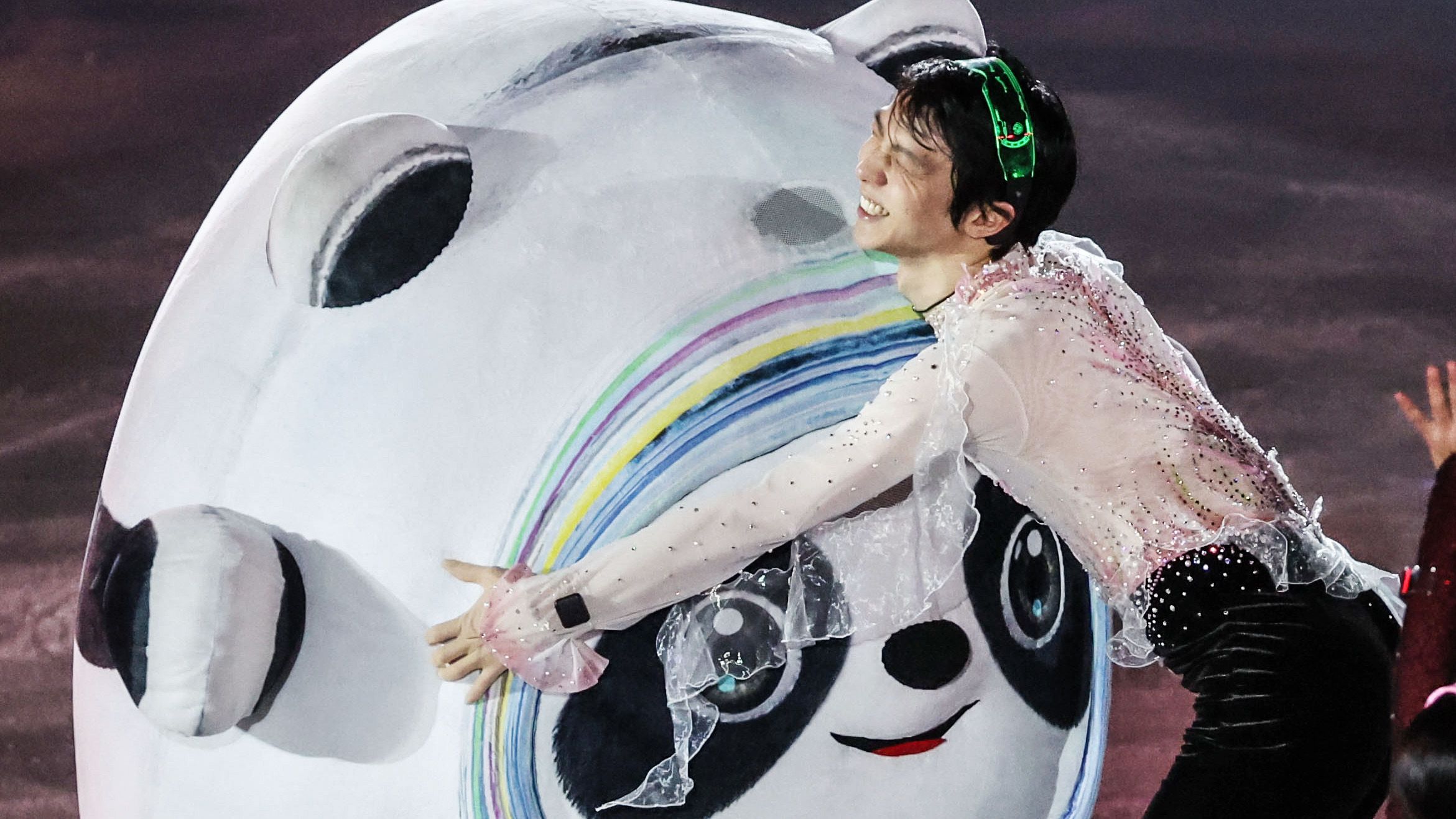 Hanyu embraces Bing Dwen Dwen, the Beijing Olympics mascot, after an exhibition performance. Despite going home without a medal, he departed his final Olympics with a smile. (Photo by Koji Uema)