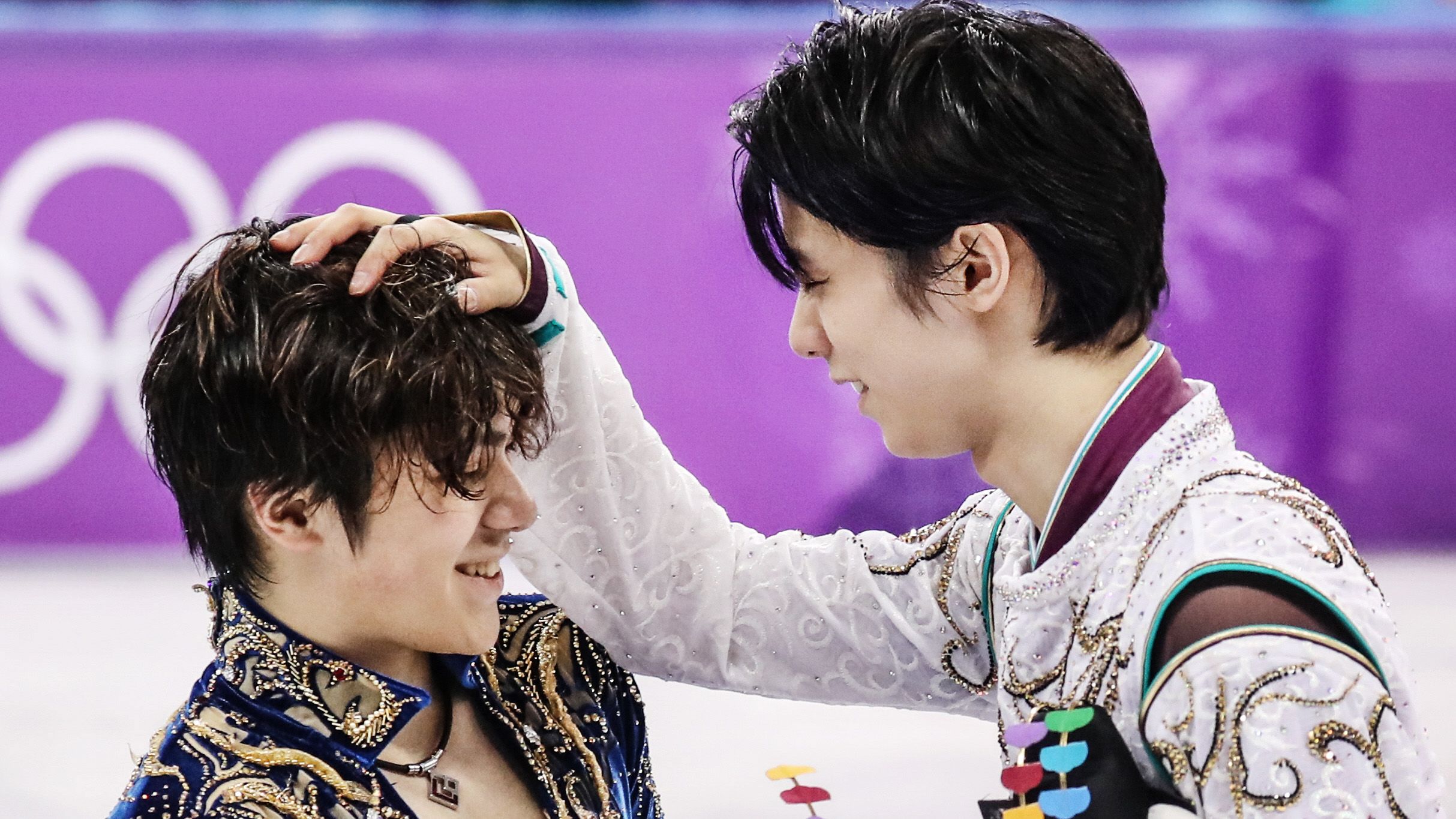 Hanyu with fellow Japanese figure skater Shoma Uno after the medal presentation at PyeongChang. (Photo by Koji Uema)