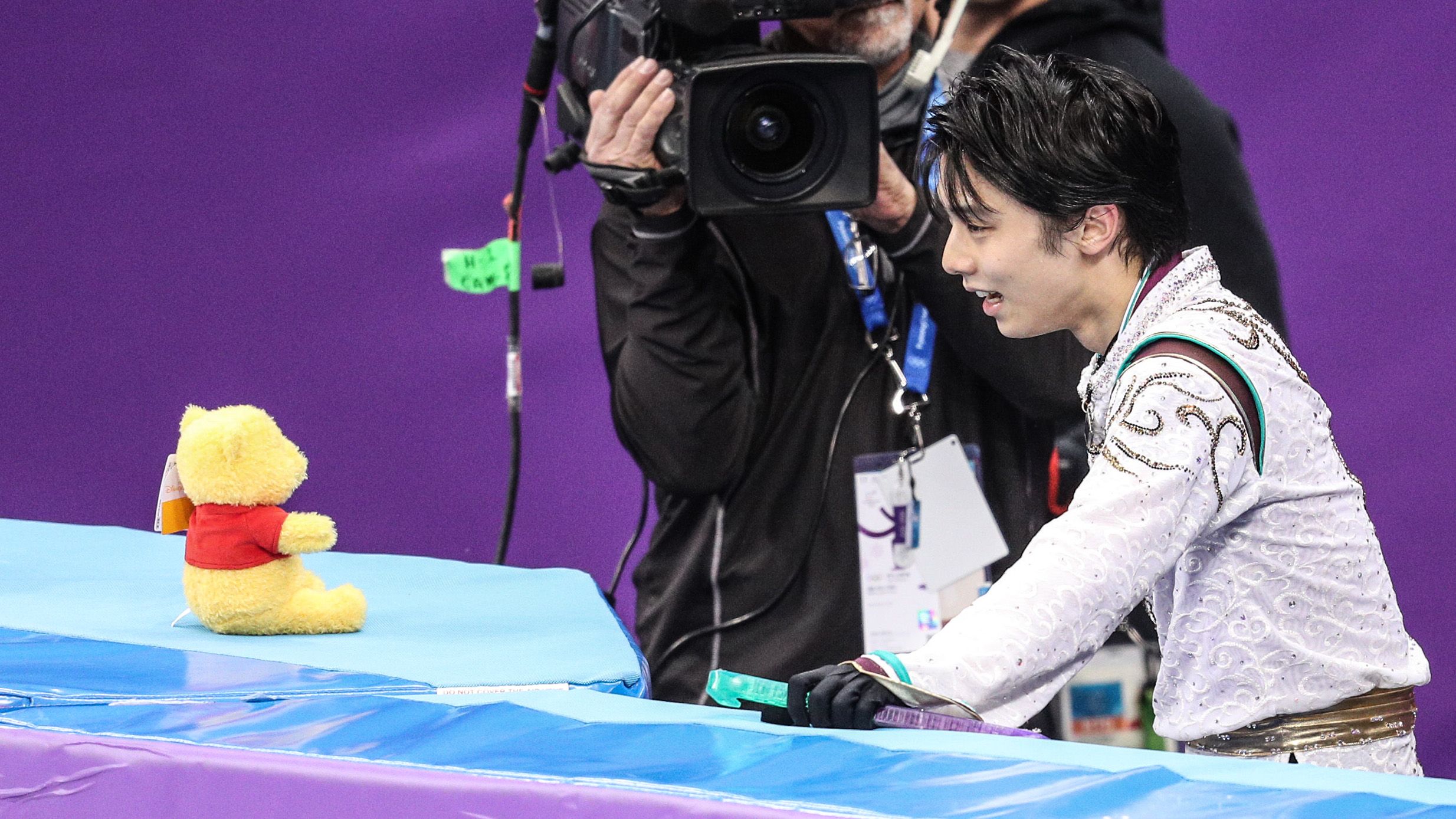Hanyu with Winnie the Pooh stuffed bears after his free skating program at PyeongChang. (Photo by Hirofumi Yamamoto)