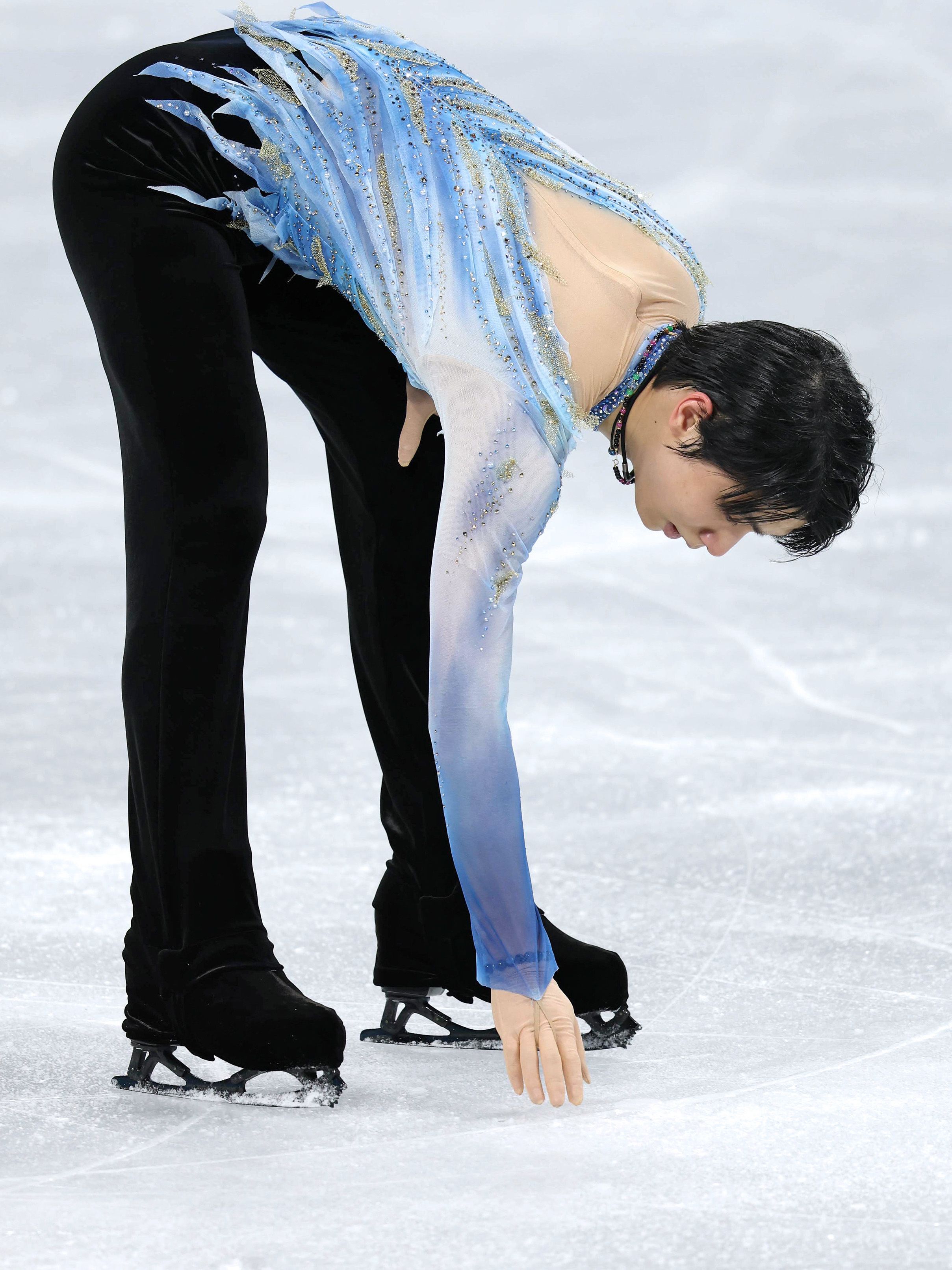 Hanyu went to 8th place after failing to achieve an unprecedented quad axel at the start of his short program on Feb. 8. Afterwards, he inspected a crack in the ice that may have caused the failure. (Photo by Koji Uema)