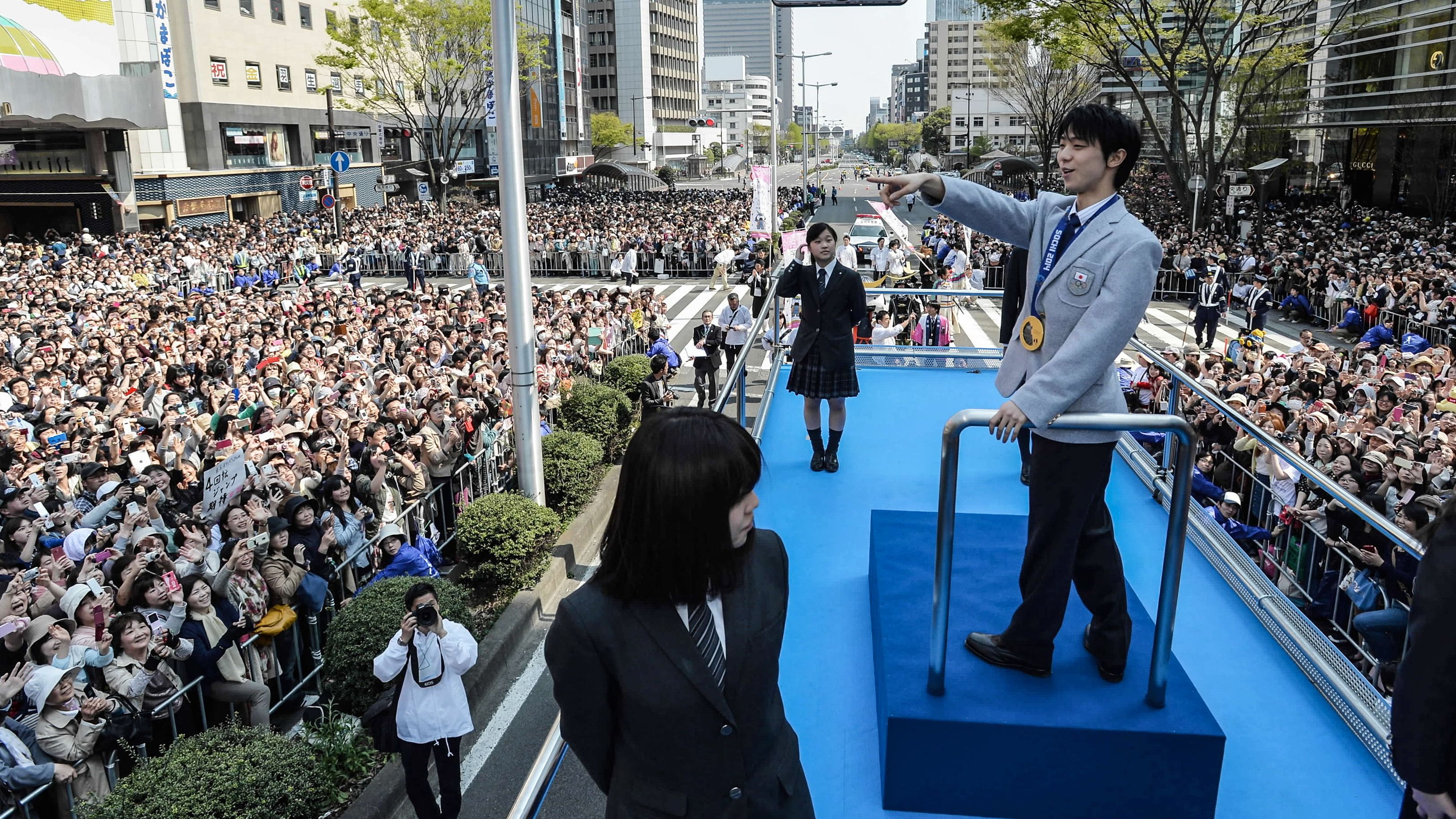 Hanyu at the massive victory parade upon his return home to Sendai on April 26, 2014. (Pool photo)