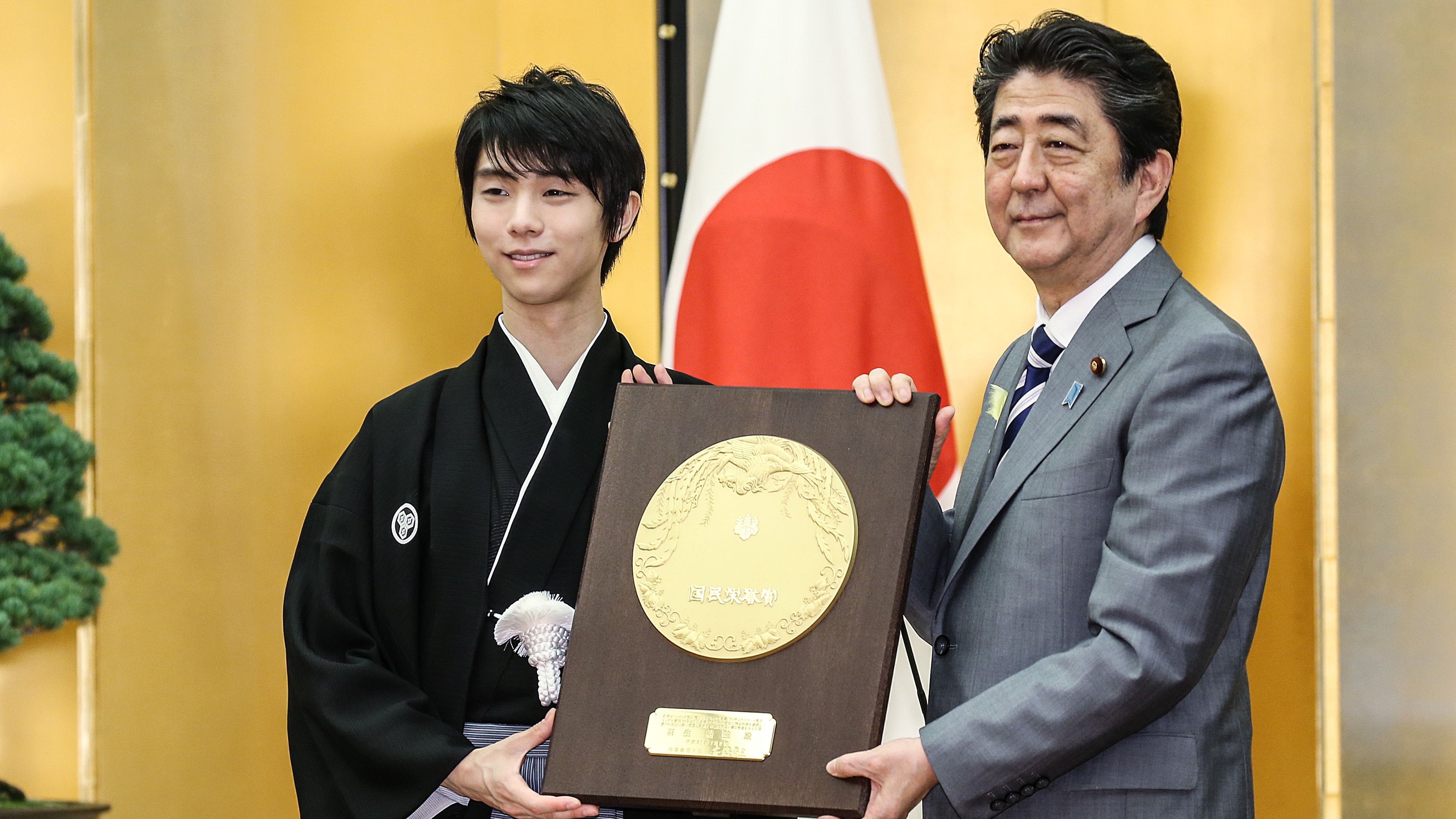 Hanyu receives the People’s Honor Award from Prime Minister Shinzo Abe at the Prime Minister’s Office on July 2, 2018. (Photo by Uichiro Kasai)